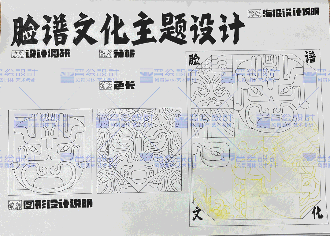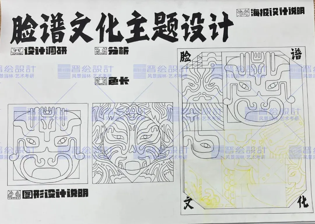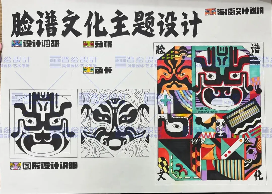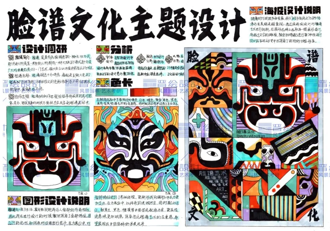 同时由于本次题目给的是脸谱图案,在颜色的选取中也要进行慎重选择,可以尝试带有中国风色彩的马克笔颜色进行填充,如果考试后期时间充足的情况下,可以选用彩铅进行细节的添加。