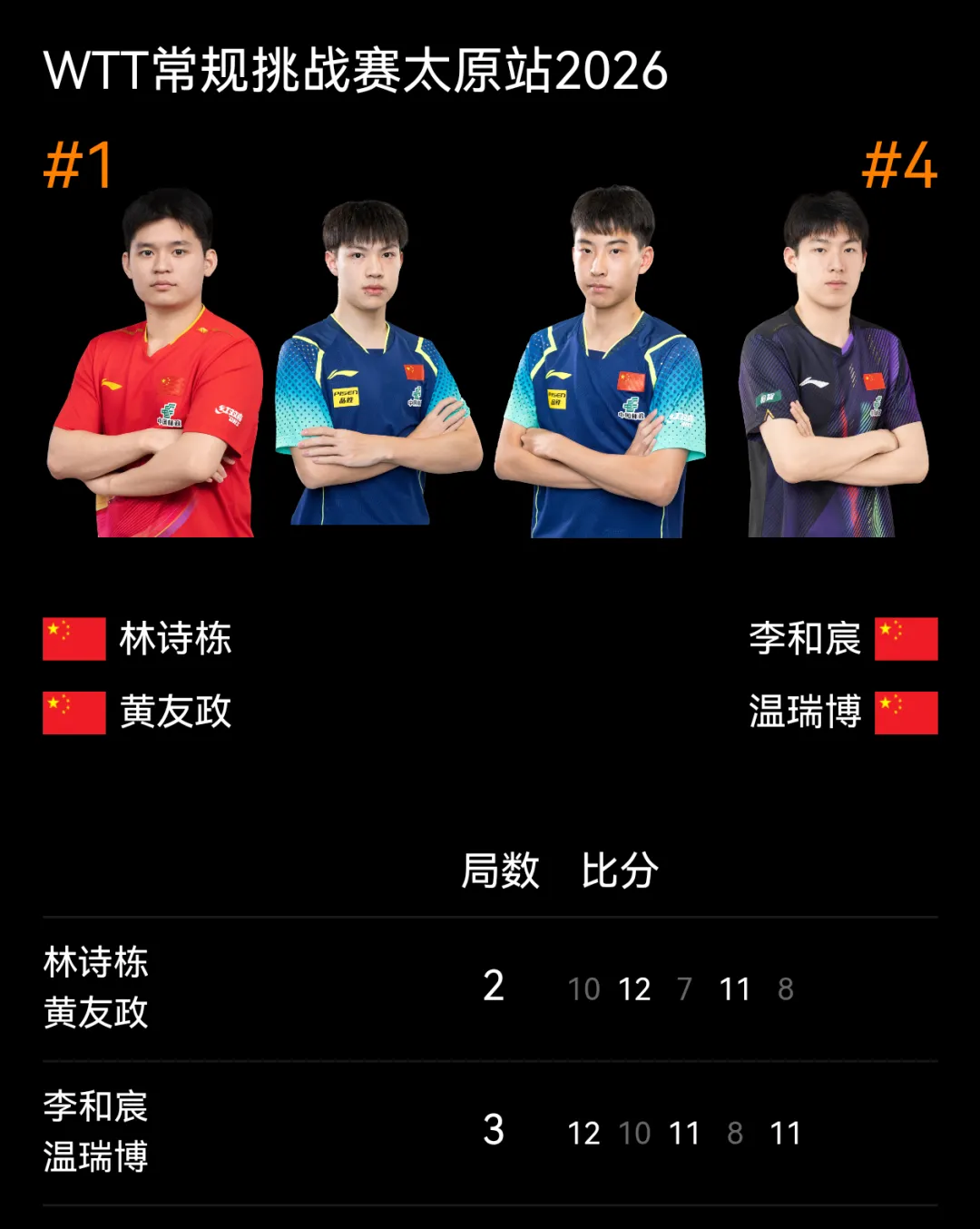 WTT常规挑战赛太原站,国乒凭借林诗栋/黄友政与李和宸/温瑞博的优异表现,已提前会师男双决赛。在今天下午进行的这场内战角逐中,双方打满五局,李和宸/温瑞博3-2力克林诗栋/黄友政,摘得男双桂冠,国乒也收获了本站比赛的第三金。
