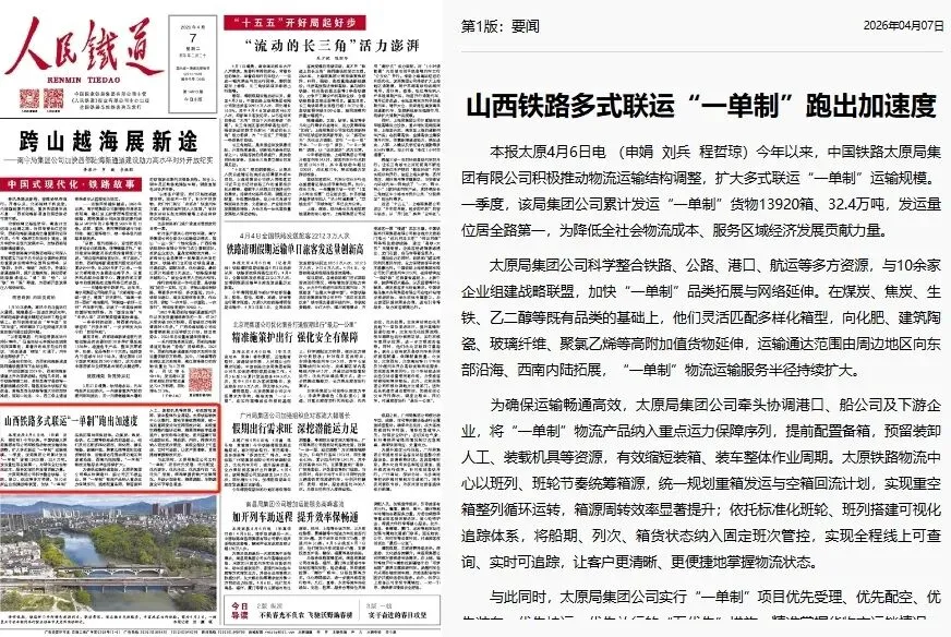 《人民铁道》报刊发《山西铁路多式联运“一单制”跑出加速度》文章
