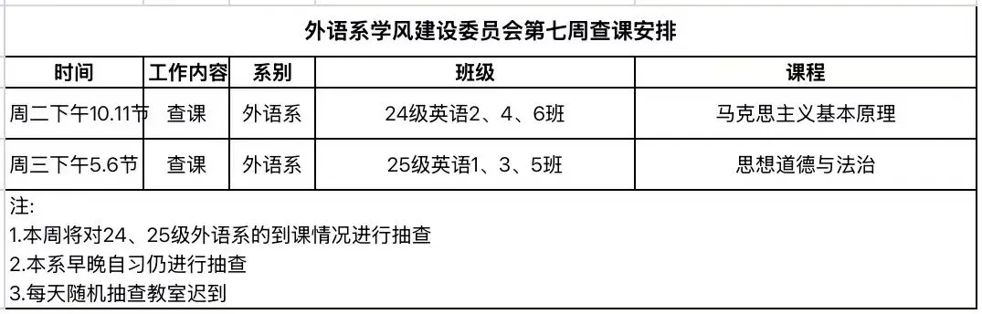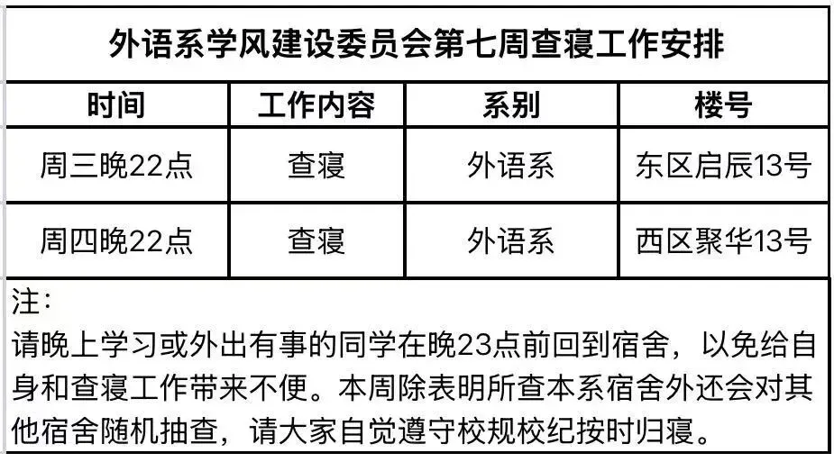 外语系学风建设委员会第七周协助老师查课查寝安排如下: