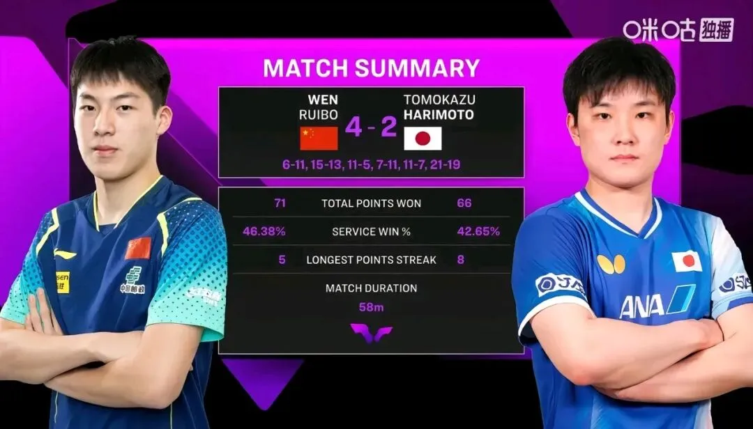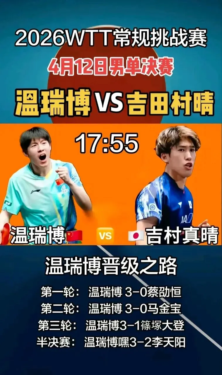开局吉村真晴凭借老道的大赛经验和台内控制,与温瑞博交替拿分,拿下第三局后以2-1建立领先优势。