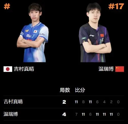 总比分4-2!温瑞博战胜吉村真晴,加冕男单冠军!