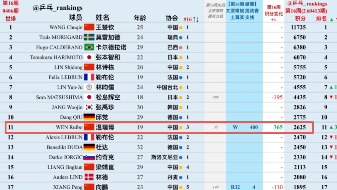 最新一期世界排名随之更新,温瑞博凭借本站冠军积分升至世界第 11 位。总积分达到 2625 分,这一排名创下他职业生涯新高。他在国乒男队内部排名超越梁靖崑、向鹏、周启豪等人。成为仅次于王楚钦、林诗栋的第三号选手,距离世界前十仅有 150 分的差距。