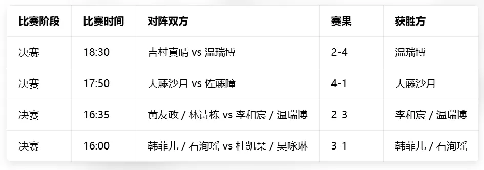4月12日晚,2026年WTT常规挑战赛太原站圆满落幕。主场作战的中国乒乓球队在本站赛事中展现强劲统治力,包揽混双、女双、男双、男单四枚金牌,日本队获得女单冠军。(1)WTT太原站2026年4月12日赛事结果汇总表- 男单决赛:温瑞博4-2吉村真晴(日本)19岁的温瑞博在决赛中力克日本名将吉村真晴,夺得个人本站赛事第二金(男单、男双)。他在本站比赛中先后击败两位日本世界冠军(篠塚大登、吉村真晴),展现了出色的竞技状态。