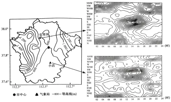(1)指出图中太原市城区的山谷风风向。