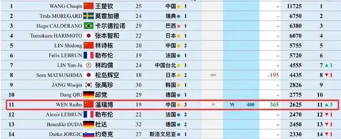 凭借本站豪夺男双、男单冠军,温瑞博获得400积分,总积分从2260分涨至2625分,世界排名也从第14位跃升至第11位,这不仅创下了他个人职业生涯排名的新高,更在男队内部完成了一次惊人飞跃。