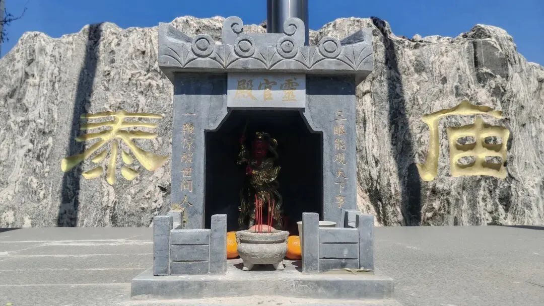 入庙之径,两侧翠柏苍劲,紫叶李花影婆娑,晴光铺洒在水泥路面上,树影斑驳,一步一景,直引向庙门。迎面巨石镌“泰山庙”,金漆熠熠,旁立灵官殿石龛,龛额“灵官殿”三字端方,楹联“三眼能观天下事,一鞭惊醒世间人”,道尽王灵官护法镇庙之威,红面金盔的神像前,香烛袅袅,橙果供案,烟火气与庄严感交融。