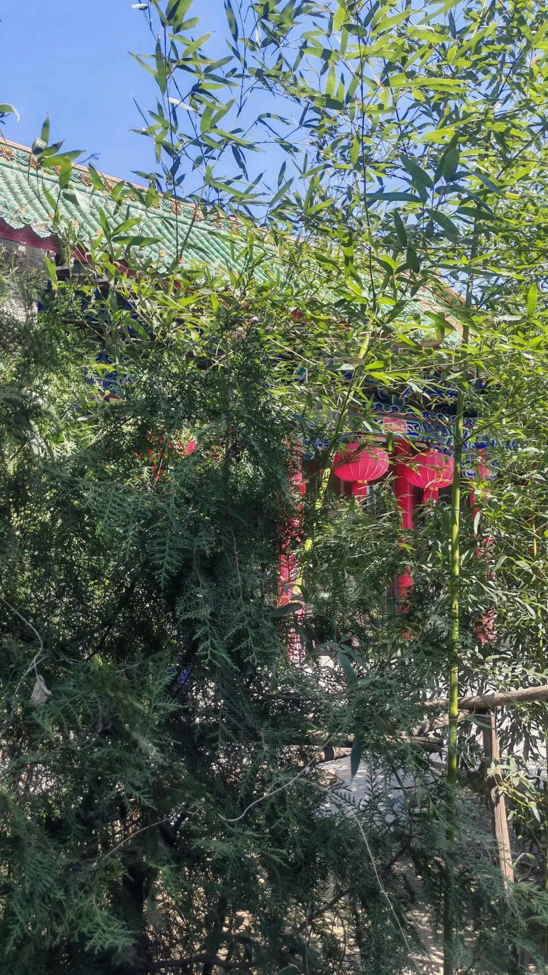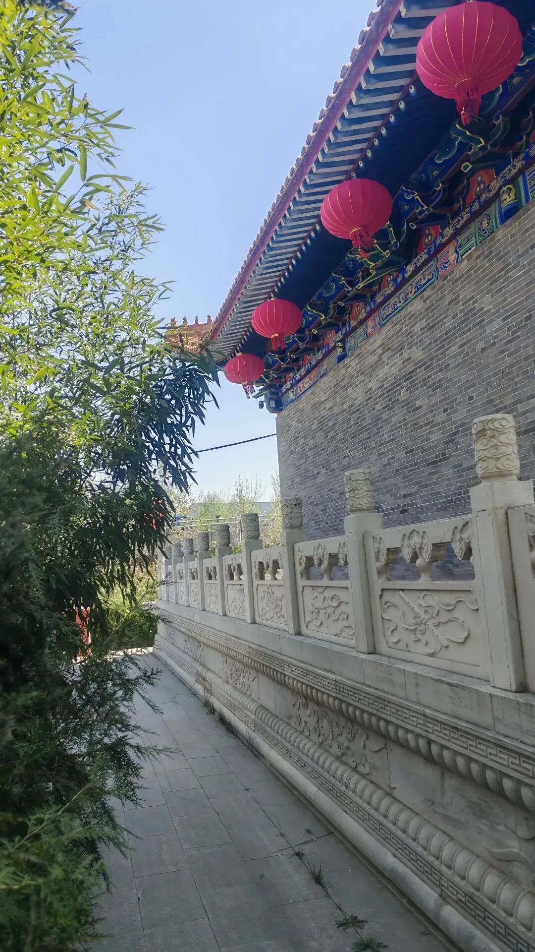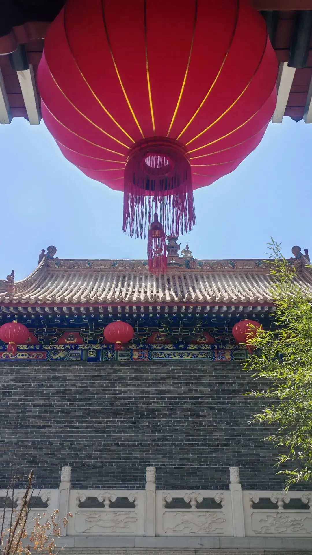 殿宇错落,财神殿灰墙红门,灯笼高挂,楹联“通天下财源普沾吉庆,掌人间福禄永赐丰盈”;旁侧殿宇绿瓦青砖,朱柱红联,隐于竹树之间,更添清幽。