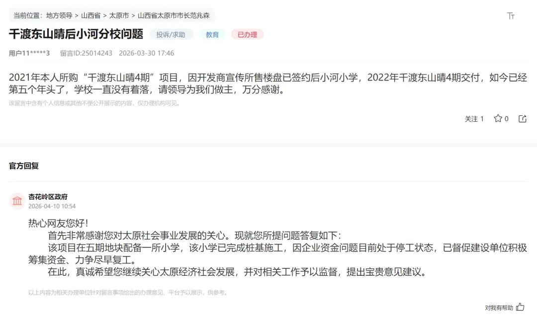 近日,有网友在领导留言板发起了咨询:2021年本人所购“千渡东山晴4期”项目,因开发商宣传所售楼盘已签约后小河小学,2022年千渡东山晴4期交付,如今已经第五个年头了,学校一直没有着落。官方回复称:该项目在五期地块配备一所小学,该小学已完成桩基施工,因企业资金问题目前处于停工状态,已督促建设单位积极筹集资金、力争尽早复工。买房看似简单的事儿,其实背后涵盖的信息量巨大宏观的包括经济、规划、金融、交通配套、教育、城市逻辑,微观的方面包含产品、户型、园林、入户大堂、装修、采光、噪音、容积率、烂尾风险等等。买房不入坑,欢迎加微信咨询太原买房那些事儿。
