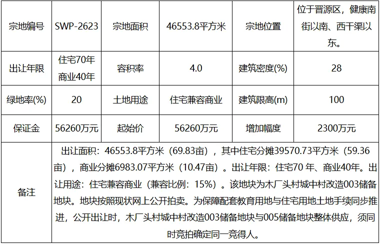 地块起始价5280万元。该地块为杏花岭区城中村改造南窊谷旦柏杨树村安置房建设项目地块二。地块按现状网上拍卖公开出让。