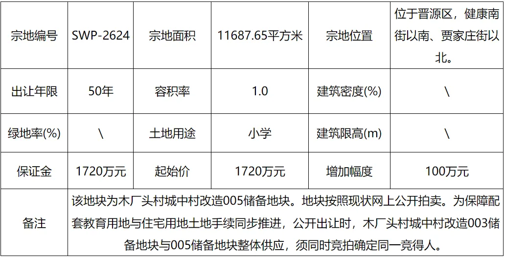 宗地编号SWP-2624,出让面积11687.65平方米(17.53亩),宗地位于晋源区,健康南街以南、贾家庄街以北。土地用途为小学用地。