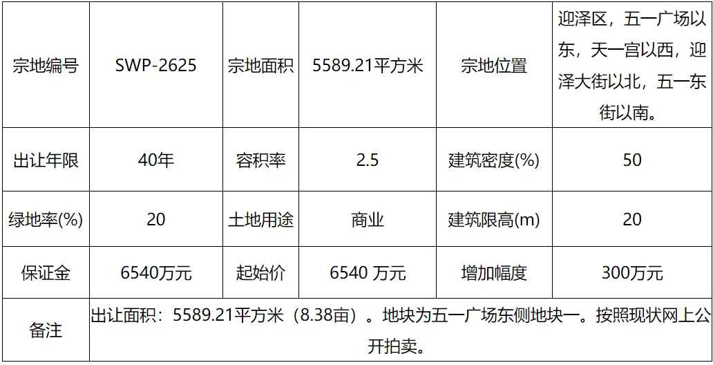 地块起始价6540万元。该地块为五一广场东侧地块一。地块按现状网上拍卖公开出让。