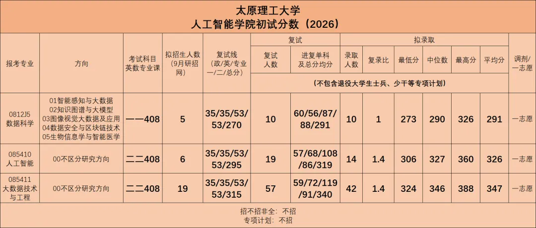 复试成绩为专业测试成绩、外国语听力及口语测试成绩、综合能力面试成绩及学术论文加分之和。1.专业测试成绩满分200分,外国语听力及口语测试成绩满分20分,综合能力面试成绩满分80分。专业测试内容严格按照招生章程的规定执行(特别是艺术、体育类按照研究方向招生的专业),成绩低于120分者复试不合格,不予录取;外国语听力及口语测试成绩低于12分者复试不合格,不予录取;综合能力面试成绩低于48分者复试不合格,不予录取。2.学术论文加分:与报考专业相关的学术论文、学术专著、专利等成果(署名第一)公开发表每项加1分;中文核心刊物每篇加5分;SCI、CSSCI收录期刊论文每篇加10分(上述加分可累加,但总分不超过10分)。培养单位参照上述标准认定考生学术论文加分项成果,必要的资料须留存一年以上备查。复试主要对考生的创新能力、专业素养和综合素质及英语水平能力进行考查。 (1) 思想政治与综合文化素质考核及身体健康状况考察 该考核内容不计入复试成绩,思想政治素质考查不合格不予录取。 该考核环节由考生在题库中随机抽选题目2道进行口头作答。复试专家根据表现给出得分。 重点考查大学阶段学习情况及成绩,在本学科领域发展潜力、创新精神、科研能力,以及参加文化体育活动、 公益劳动表现等方面情况。 录取总成绩=[政治+外语+(业务课一)+(业务课二)] /折算百分制系数×0.8+复试成绩×0.2参加复试的考生,在本专业内(以2026年硕士研究生招生目录公布的专业为准)按照录取总成绩由高到低排序录取。人工智能学院: