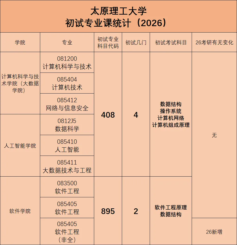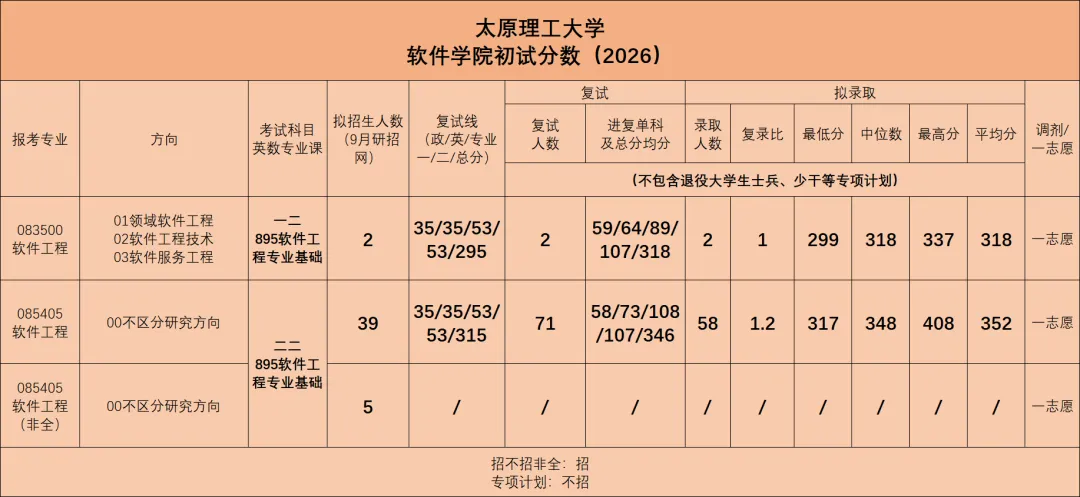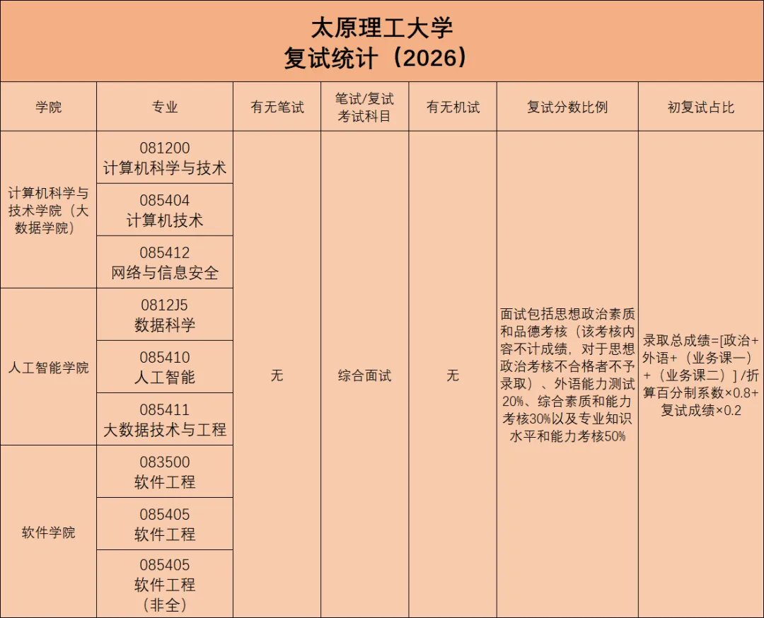 复试主要是对考生的创新能力、专业素养和综合素质进行考查。由招生学院具体组织实施。复试考核包括思想政治素质和品德考核、专业知识水平和能力考核、综合素质和能力考核、外语水平测试以及报考资格审查。复试总分按100分计。思想政治与综合文化素质考核主要考查考生本人的现实表现,内容包括考生的政治态度、思想表现、道德品质、遵纪守法、诚实守信等方面,以及对考生过往参加美育、体育及劳动教育情况的过程性考核,同时了解掌握身体健康状况。该考核内容不计成绩,对于思想政治考核不合格者不予录取。考生所在学习或工作单位须在规定时间通过指定方式向我校提交《太原理工大学硕士研究生招生思政品德考核表》及附件的扫描件或照片。专业素质和能力考核重点考查考生对本学科(专业)理论知识和应用技能掌握程度,利用所学理论发现、分析和解决问题的能力,对本学科发展动态的了解以及在本专业领域的发展潜力、创新精神和创新能力。专业知识水平和能力考核必须抽题作答。抽题作答环节尽可能采用综合性、开放性的能力型试题,由考生在复试题库中随机抽选题目2道进行作答。该项考核要突出分类选拔,学术学位重点考核考生的学术素养、对学科知识掌握与运用情况、科研创新能力,专业学位重点考核考生的专业基础、实践能力和职业素养。复试专家根据考生表现给出得分。专业知识水平和能力考核时间累计不少于10分钟。综合素质和能力考核重点考查考生大学阶段学习情况及成绩,在本学科领域发展潜力、创新精神、科研能力,本学科(专业)以外的学习、科研、社会实践(学生工作、社团活动、志愿服务等)以及参加文化体育活动、公益劳动表现等方面的情况,事业心、责任感、纪律性(遵纪守法)、协作性和心理健康情况;人文素养、举止、表达和礼仪等。外语能力测试重点考查考生对外语基本知识的掌握、表达能力。外语能力测试由复试面试小组负责实施。考生使用初试外语语种进行测试,面试小组专家根据考生表现给出得分。外语能力测试时间不少于3分钟。注:①复试面试时间不少于20分钟,考生明确表示已作答完毕的可提前结束考核;③学院复试面试小组对复试成绩不合格的考生要理由充分,严格考察,做好记录(录像录音),经学院党政联席会议审核后报研究生院;④学院须在工商管理(1251)、公共管理(1252)、会计(1523)、工程管理(1256)专业学位复试中组织思想政治理论考试,成绩计入复试总成绩;⑤参加复试的专家须实名签字。学院对所有纸介质评分记录和考生作答情况均须进行电子扫描保存,其中纸介质至少保留1年,电子扫描版至少保留5年。复试录音录像电子材料至少保留5年。录取总成绩=[政治+外语+(业务课一)+(业务课二)] /折算百分制系数×0.8+复试成绩×0.2参加复试的考生,在本专业内(以2026年硕士研究生招生目录公布的专业为准)按照录取总成绩由高到低排序录取。软件学院: