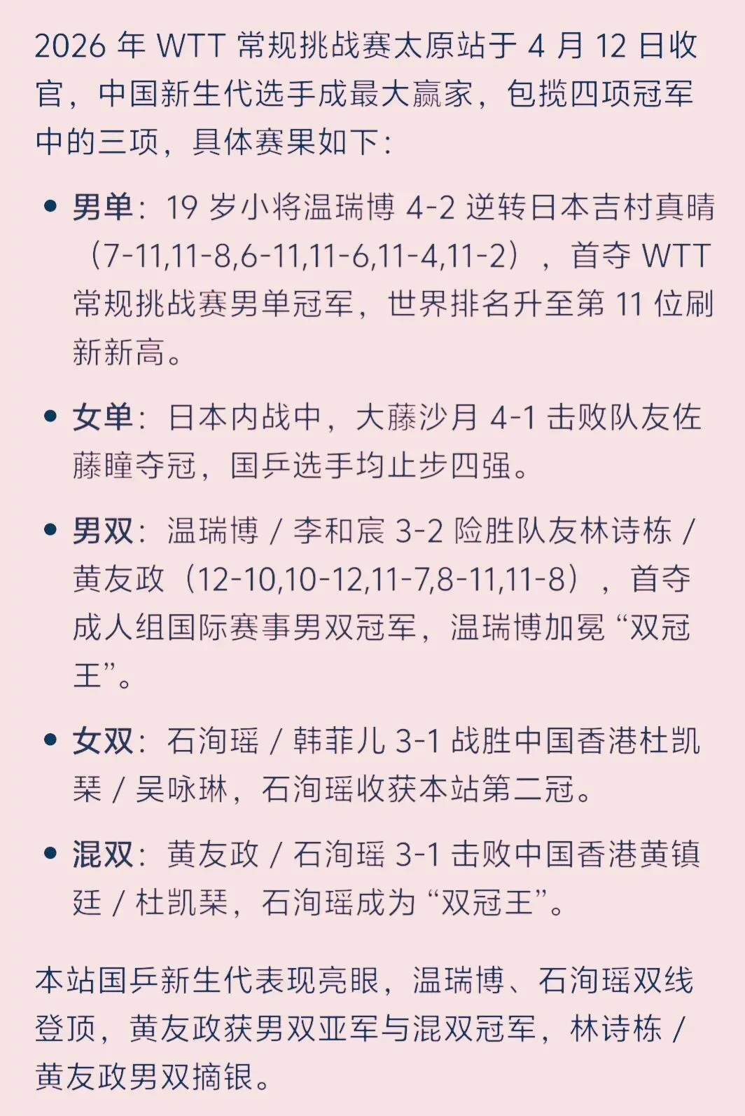 杀疯了,WTT太原赛国乒黑马1天4战全胜有望赶超莎莎曼昱