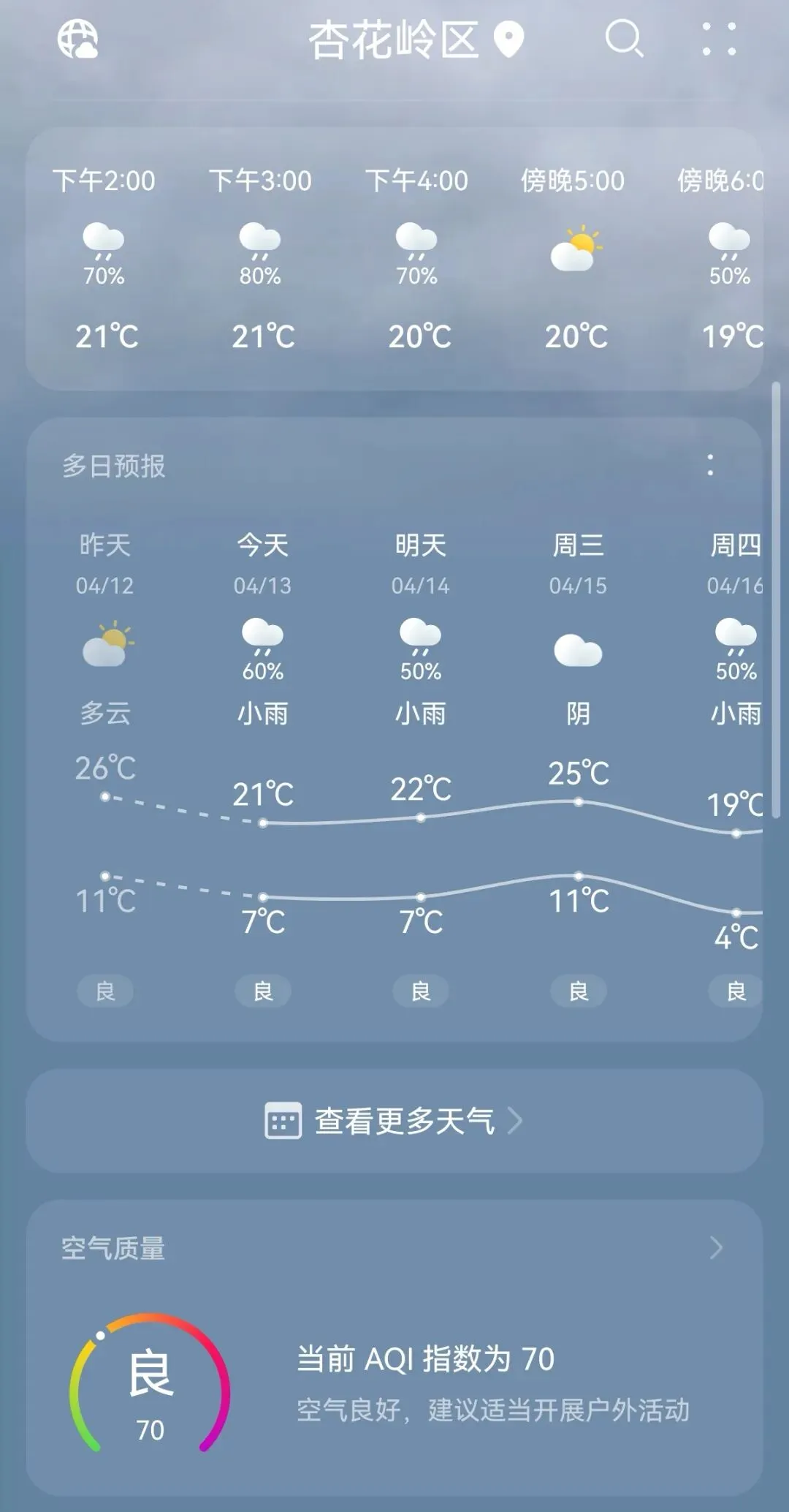 太原今天阴转阵雨,气温7℃~22℃,午后雨越下越大,傍晚直接掉到11℃左右。