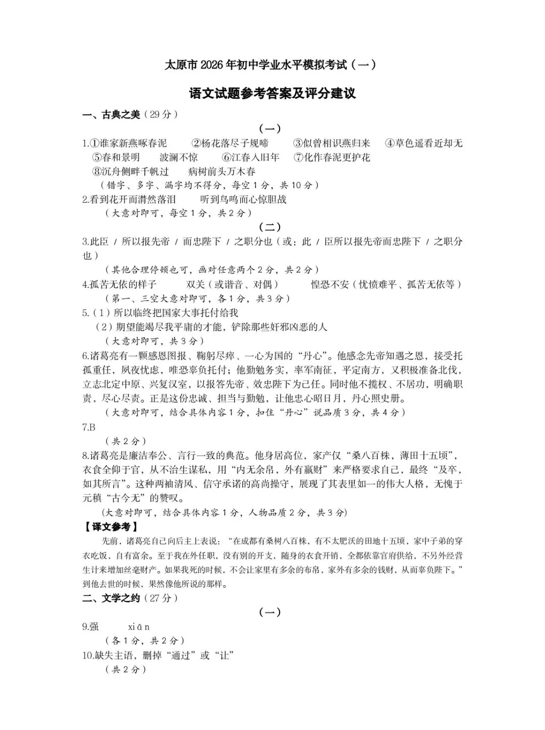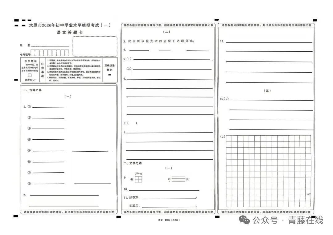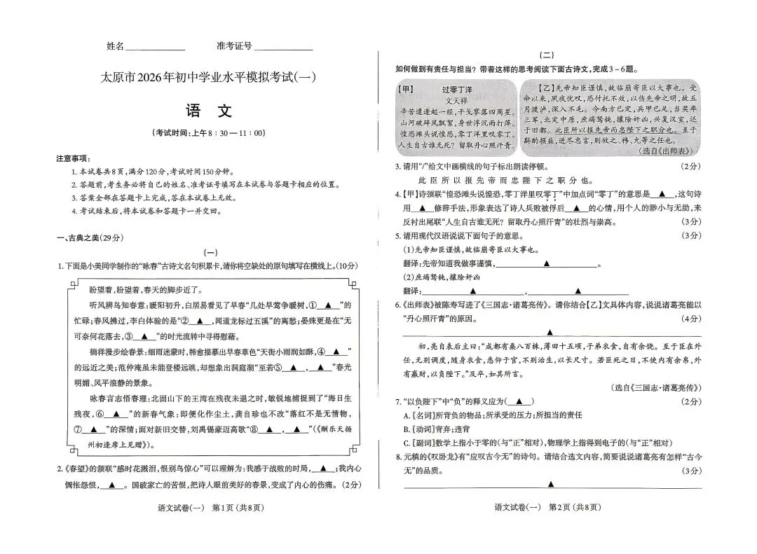 太原市2026年初中学业水平模拟测一)语文(试卷及分析+答案)
