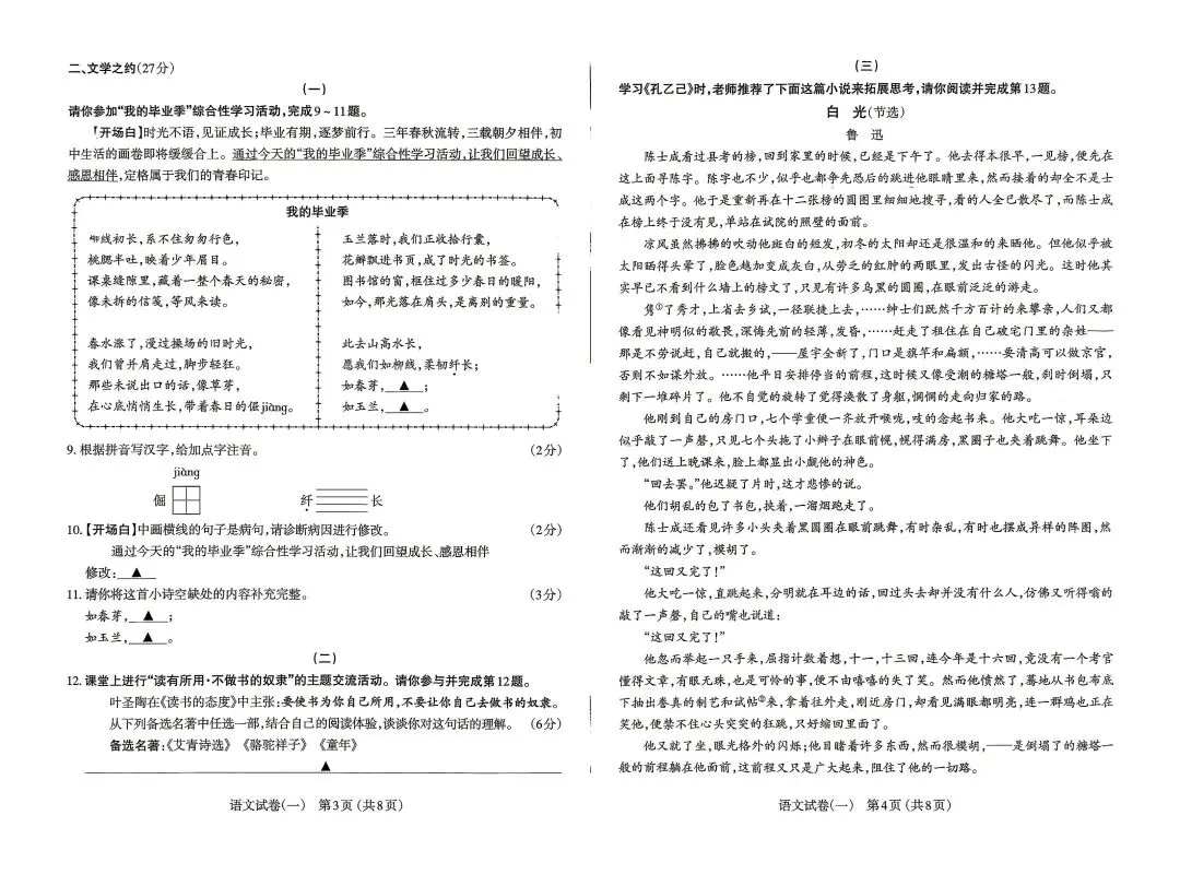 整体而言,这份语文试卷,重基础、强素养、练思维、融文化,既注重基础知识与基本能力的巩固,又强化核心素养与思维品质的提升,既传承传统文化底色,又贴近当代学生生活,对学生中考备考具有明确的指引作用,也为日常语文教学提供了清晰的方向参考。