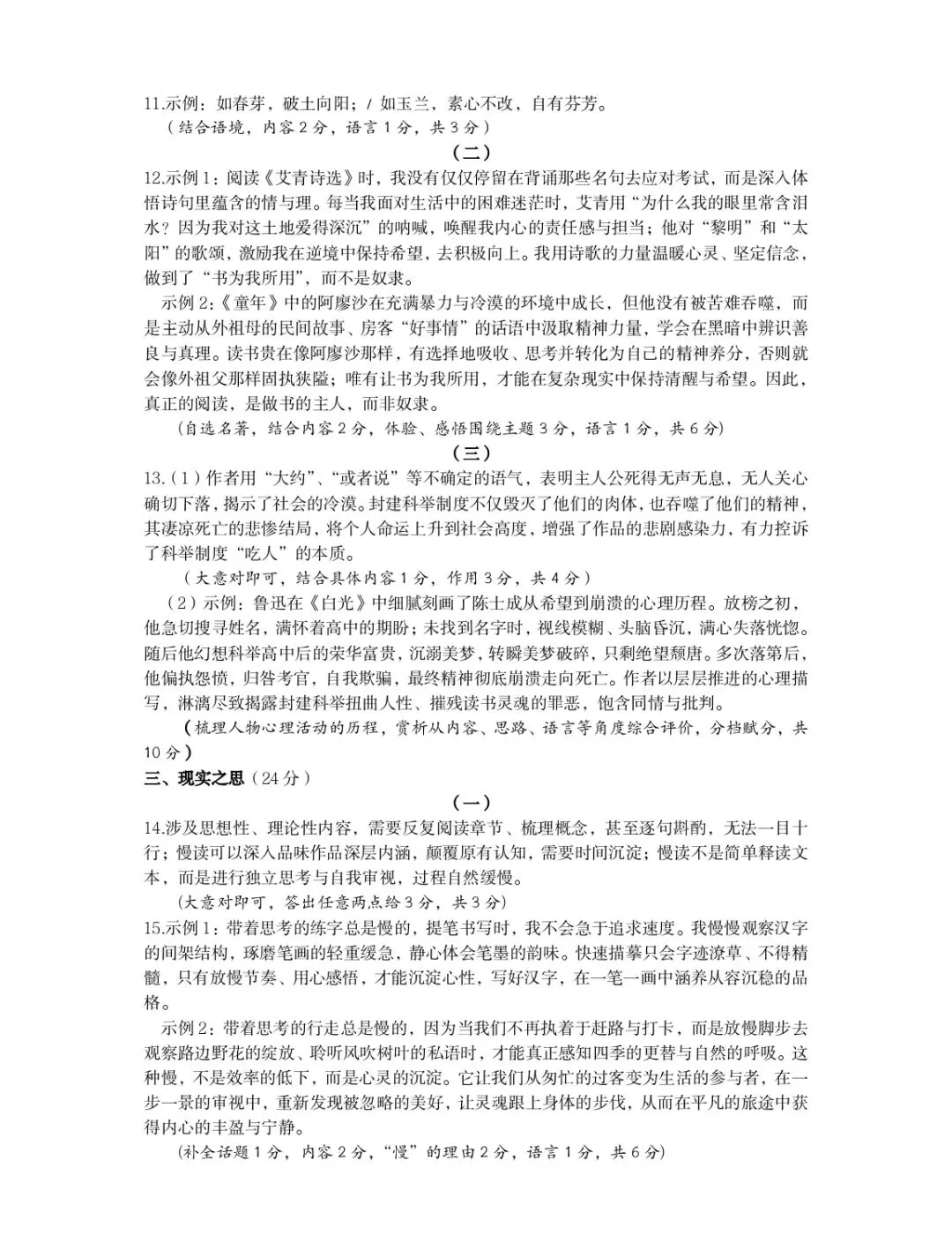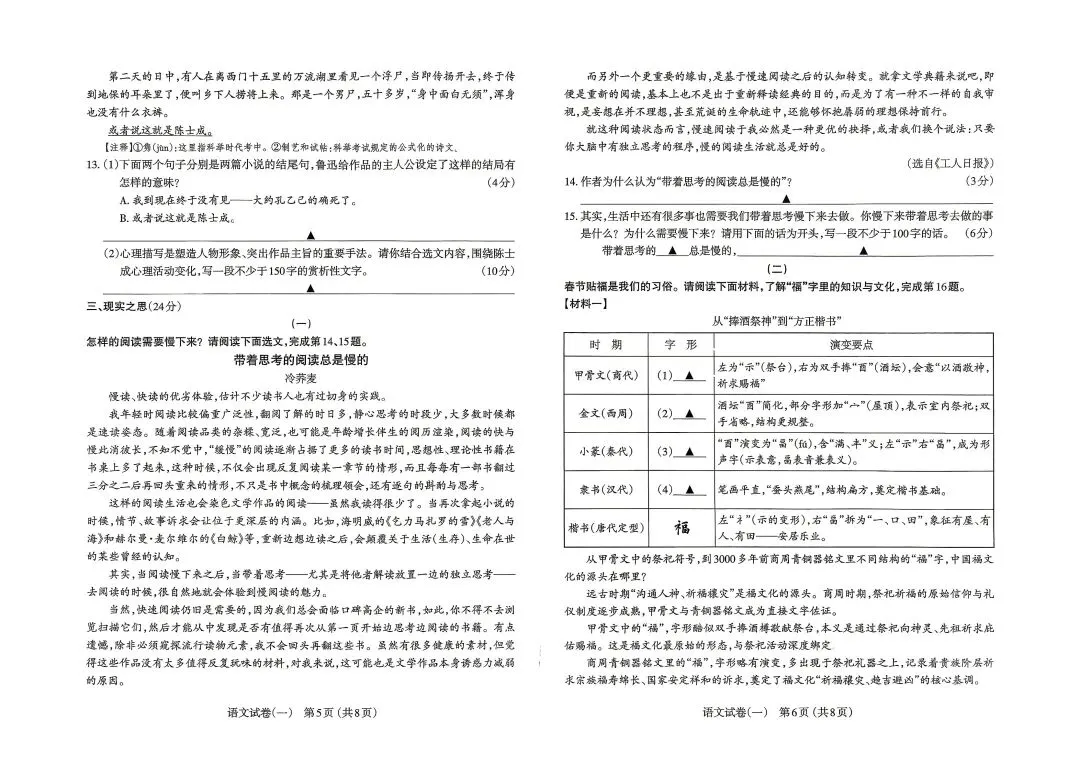 针对思维能力这一核心素养,试卷设置了多层次、有梯度的思辨性任务,名著阅读围绕“不做书的奴隶”引导学生结合整本书阅读谈独立思考,现代文阅读要求分析鲁迅《孔乙己》与《白光》结尾的深层意味、梳理陈士成的心理变化并进行赏析,议论文阅读探究“带着思考的慢阅读”的价值,非连续性文本要求提炼福文化的内涵与跨文化传播路径,这些题目从理解、分析、归纳到评价、表达,层层递进考查学生的逻辑思维、辩证思维与批判性思维,贴合课标“思辨性阅读与表达”学习任务群的目标。