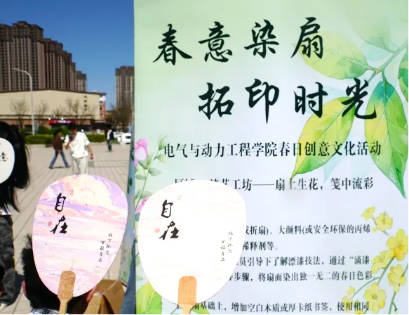 春风拂清泽,万物竞生发。为传承非遗文化、放松身心、缓解压力、激发创意、凝聚学院归属感,电气与动力工程学院学生会于迎西校区清泽小广场,再办春日创意文化活动。本次活动在前次春日活动漆扇绘制的基础上,增添了花朵拓印环节,师生同场创作,现场人气爆棚,好评如潮!