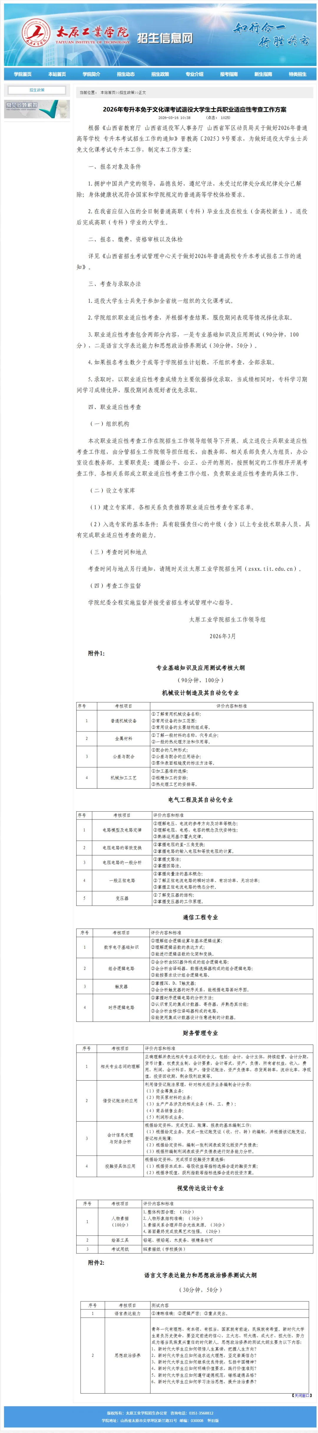 太原工业学院 | 2026年专升本免于文化课考试退役大学生士兵职业适应性考查工作方案