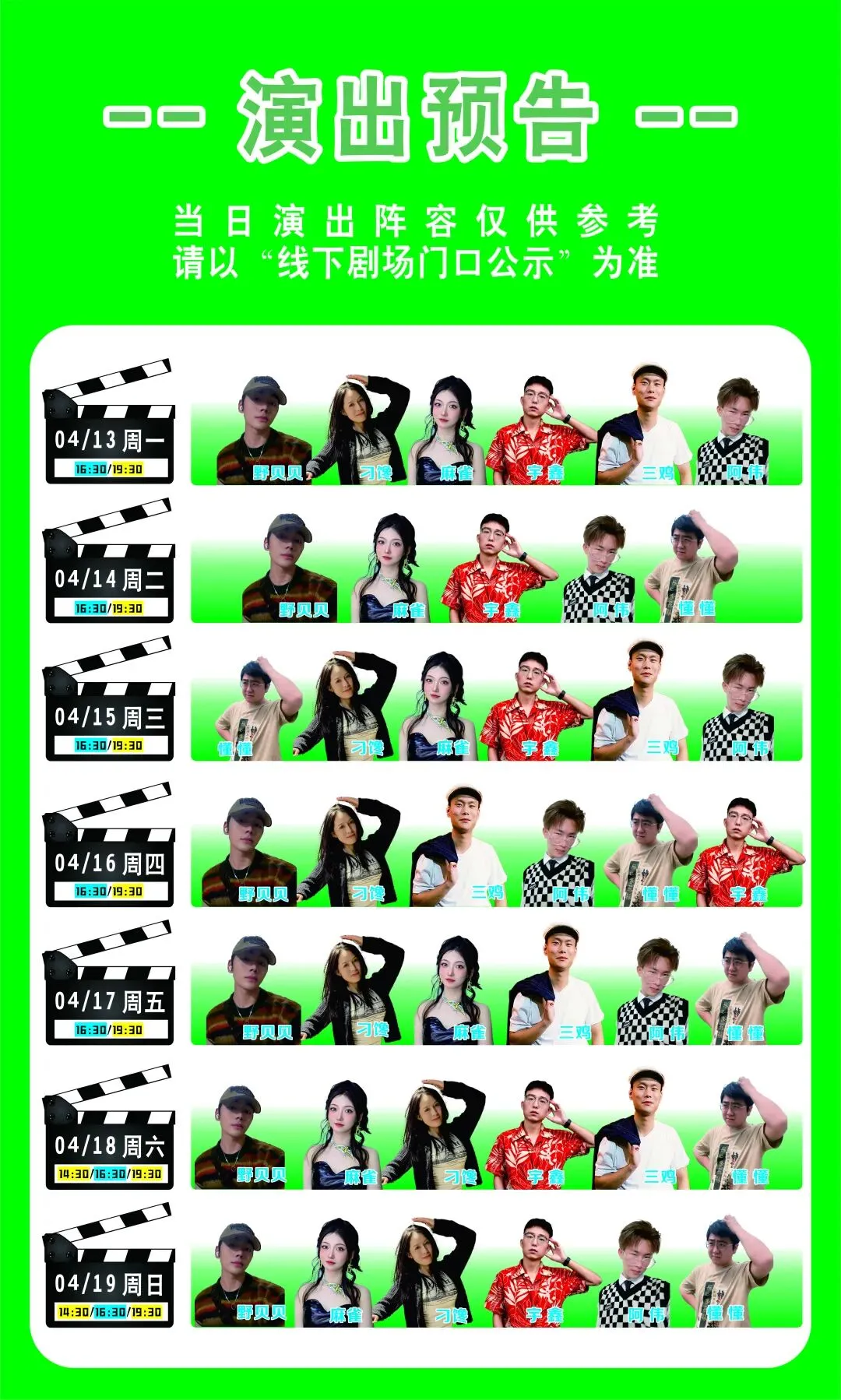 本周(4.13-4.19),我们的演员天团全员上线,从周一到周日,用最真实的生活段子、最上头的本地梗,给你带来90分钟的无压快乐。