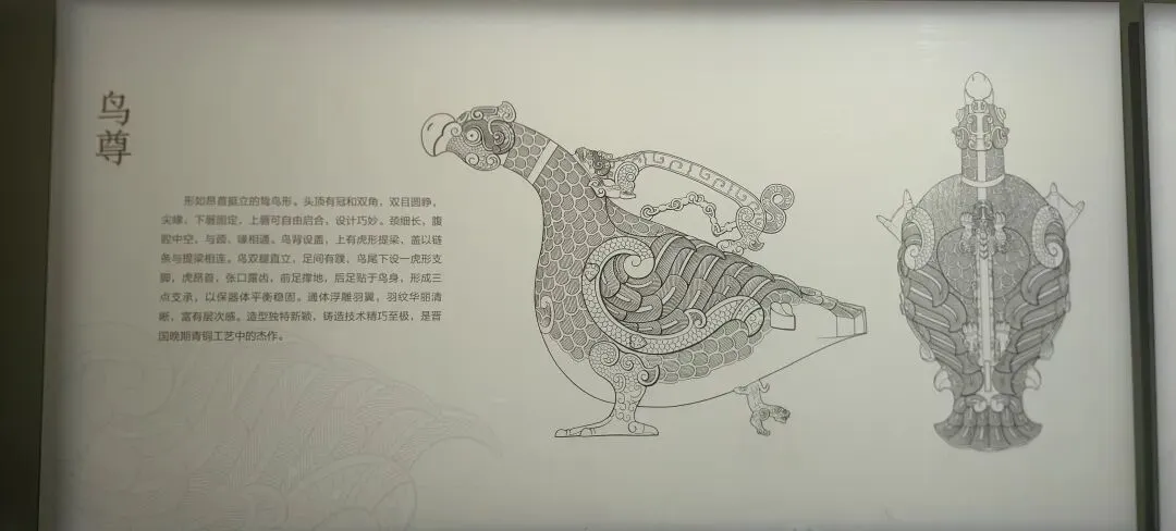 形如昂首挺立的鸷鸟形。头顶有冠和双角,双目圆睁,尖喙,下唇固定,上唇可自由启合,设计巧妙。颈细长,腹腔中空,与颈、喙相通。鸟背设盖,上有虎形提梁,盖以链条与提梁相连。鸟双腿直立,足间有蹼,鸟尾下设一虎形支脚,虎昂首,张口露齿,前足撑地,后足贴于鸟身,形成三点支承,以保器体平衡稳固。通体浮雕羽翼,羽纹华丽清晰,富有层次感。造型独特新颖,铸造技术精巧至极,是晋国晚期青铜工艺中的杰作。