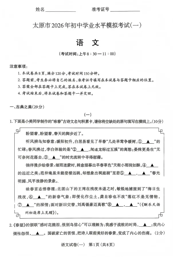 太原一模·语文2026年初中学业水平模拟考试一