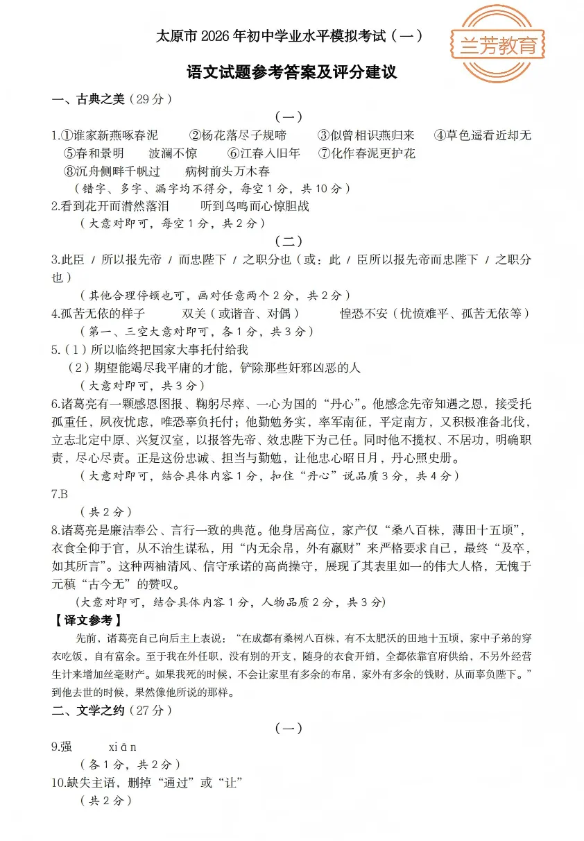 >【太原市】2026年中考一模语文试题及答案!