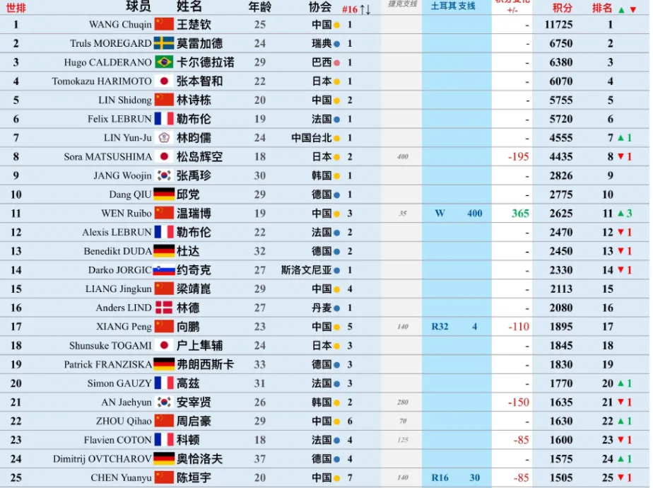 王楚钦以11725分继续稳居男单世界第一,林诗栋以5755分位列世界第5。
