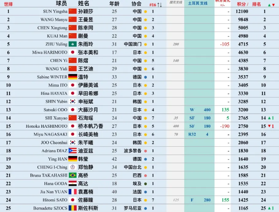 女单方面,石洵瑶凭借太原站闯入四强获得的180个积分,世界排名升至第14位。国乒依然占据绝对优势——孙颖莎以12100分高居世界第一,王曼昱以9848分位列第二,陈幸同、蒯曼分列第三和第四。日本小将张本美和近期状态火热,排名已升至世界第五。
