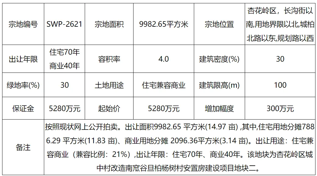 宗地编号SWP-2621,位于杏花岭区长沟街以南、城柏北路以东,出让面积14.97亩,为住宅兼容商业用地(商业占比21%),容积率4.0,建筑密度30%,绿地率30%,建筑限高100米,起价5280万元。