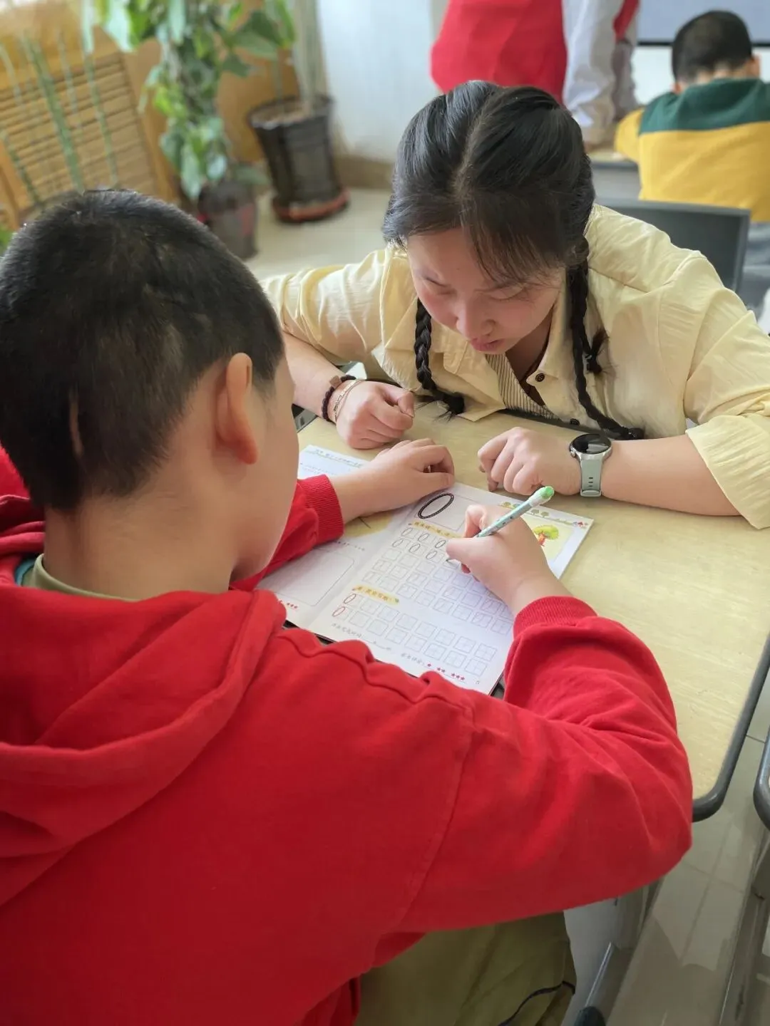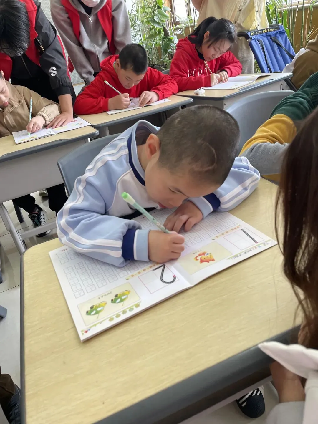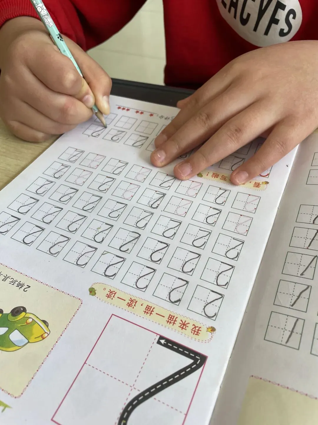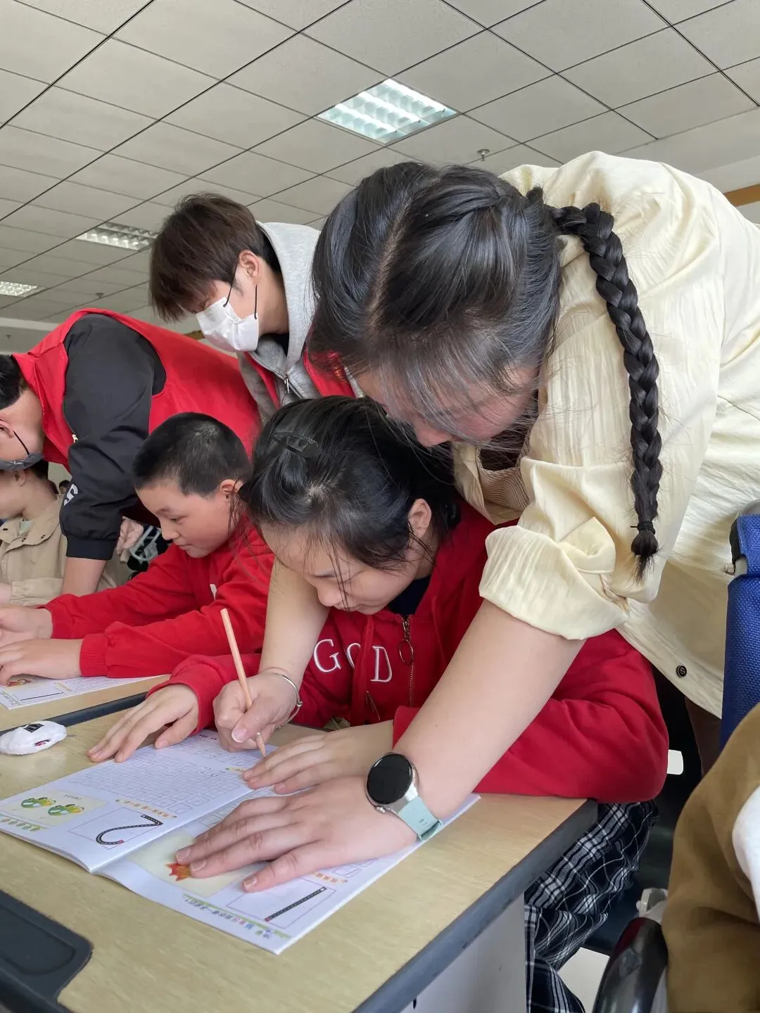 实践应用环节,孩子们拿起数字描红本,一笔一划认真书写,用心巩固所学。完成后,大家纷纷举起作品向志愿者展示,小脸上满是成就感与自豪。