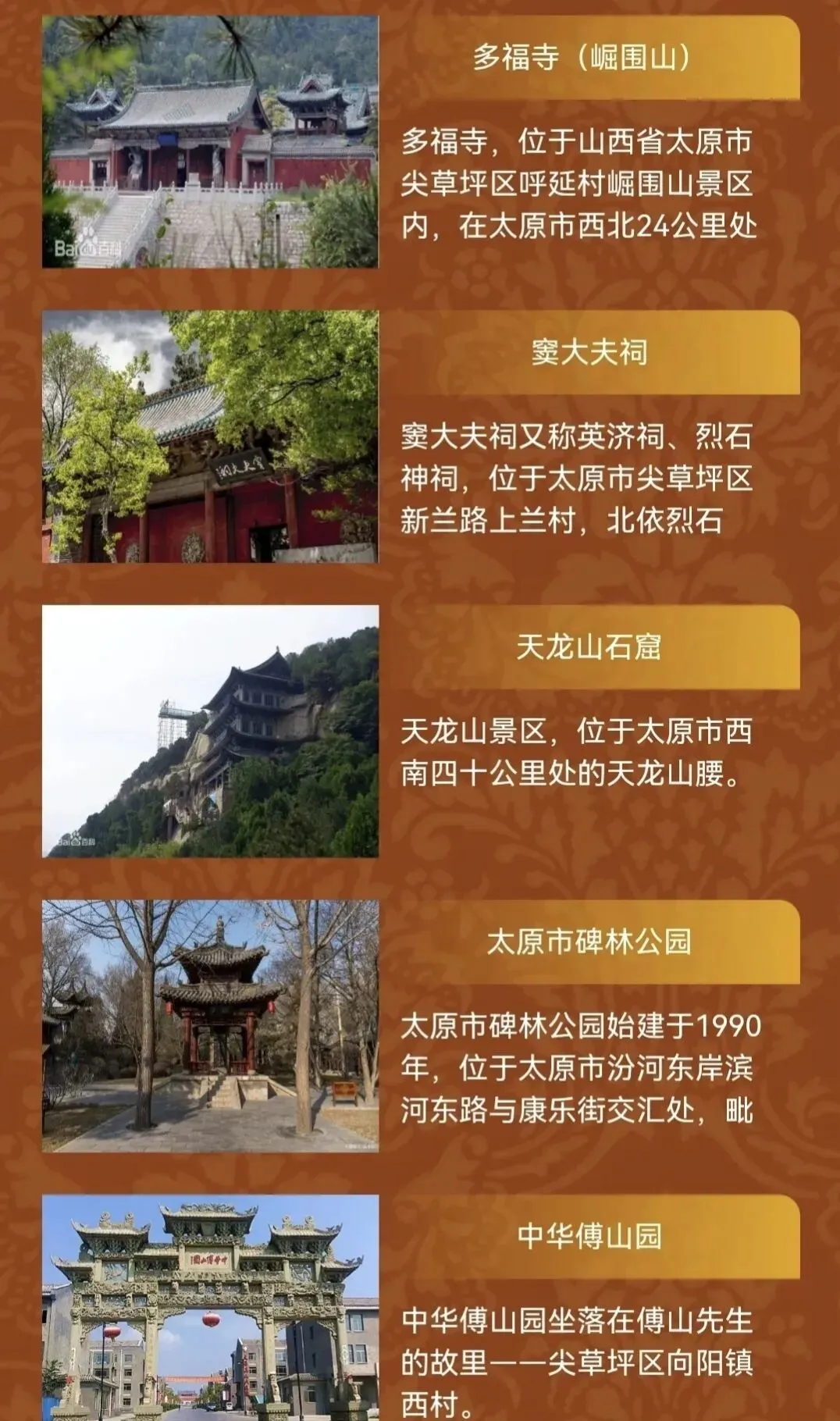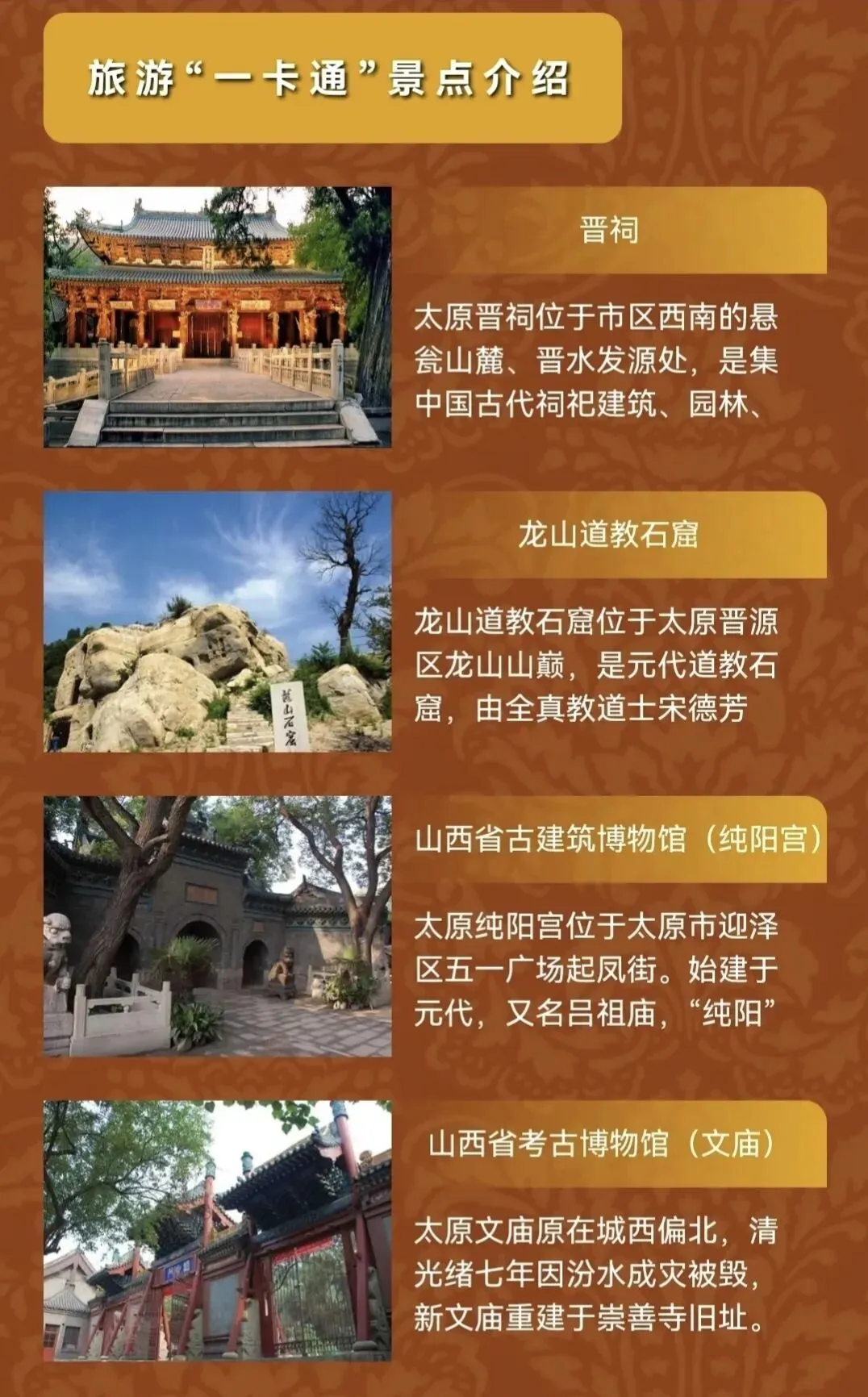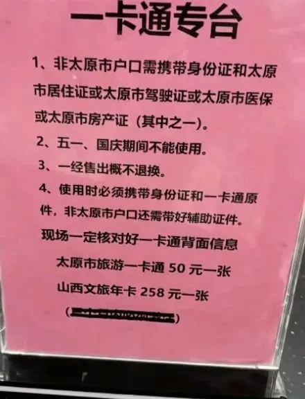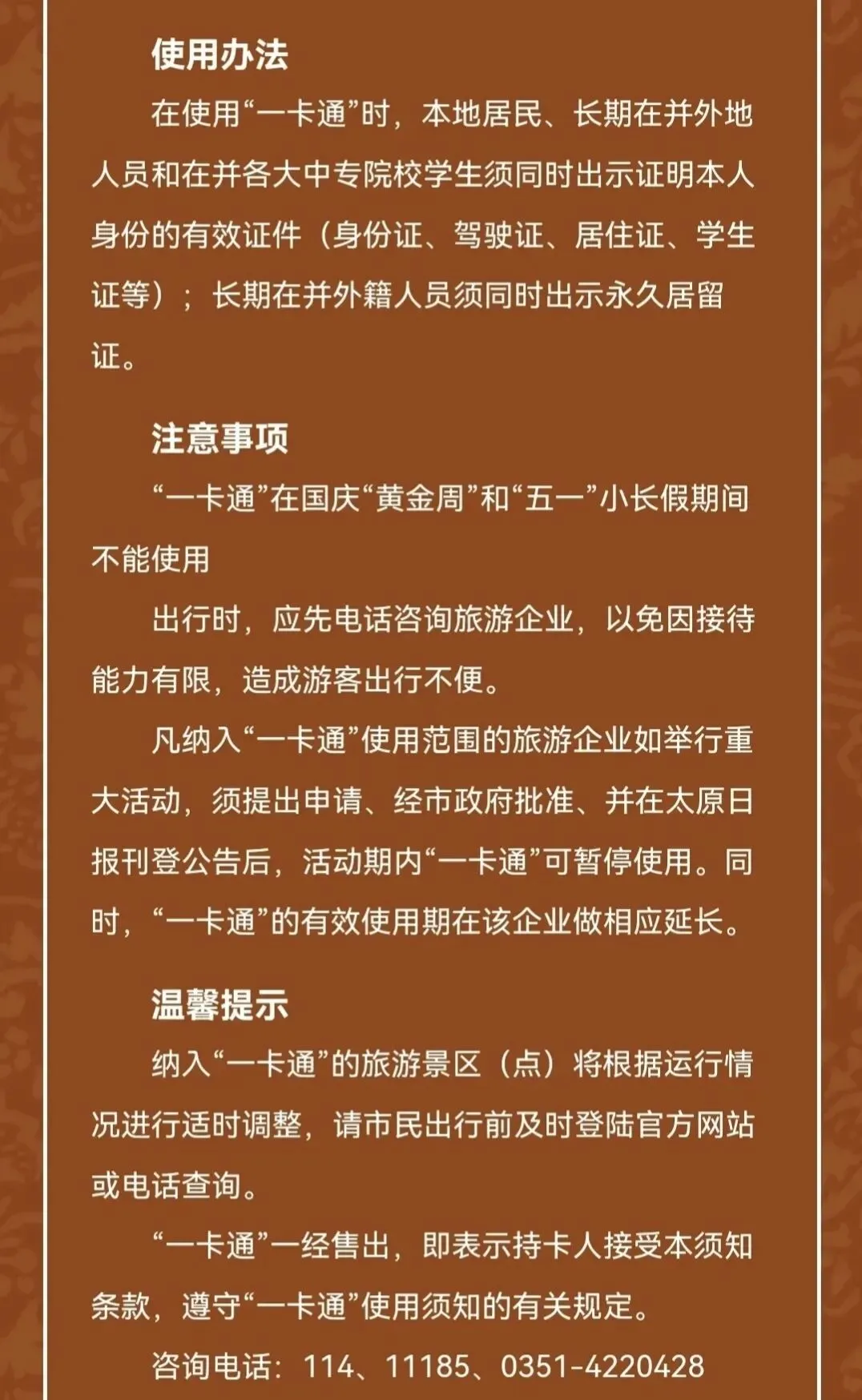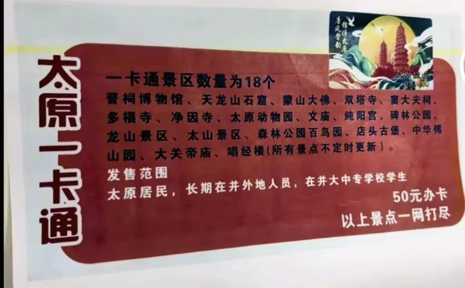 注意景区临时调整: 纳入一卡通的旅游景区将根据运行情况进行适时调整,出行前建议先通过太原市文化和旅游局官方网站或电话咨询景区,以免因接待能力有限造成不便。