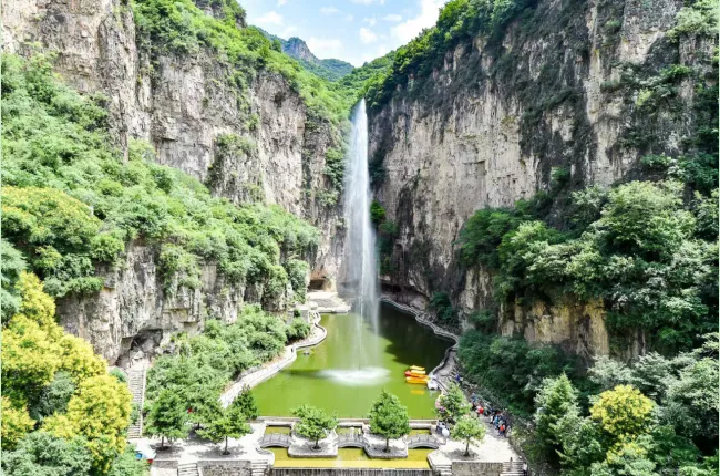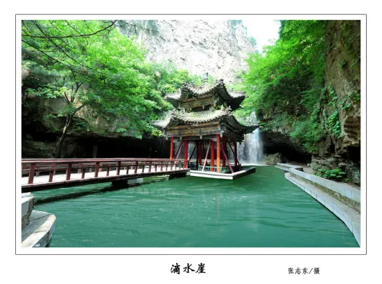 滴水崖-由于常年滴水,岩壁上形成了许多钟乳石水窝,水窝内不时有泉水叮咚而下,就像一串串滑落的珍珠。洞深处是一尊“龙王”石雕,旁边有一潭常年不涸的泉水。据说,这潭泉水取之不尽,用之不竭,永远保持咱们看到的这一水位,人称“神水泉”。后人为感谢龙王的赐水之恩,就在“神水泉”旁边塑了龙王神像。洞内泉水叮咚,洞外飞瀑喷涌,山连着水,水连着洞,此情此景多像齐天大圣居住的水帘洞啊!