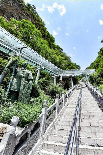 藏山炫彩5D高空玻璃悬桥——“飞云渡”,总长约168米,采用悬索结构,通行桥面宽2米,垂直落差约108米,桥面全部采用3米长的全透明航空玻璃铺设,均为双层夹胶航空钢化玻璃,具有强度高、抗弯曲、耐冲击等特点。同时采用了目前最先进的5D声光动感技术,在桥上可以体验“桥面碎裂”、“鱼在水中游,人在水上走”、以及悬空“踢足球”等效果,既有极强的挑战性,又富有娱乐性。