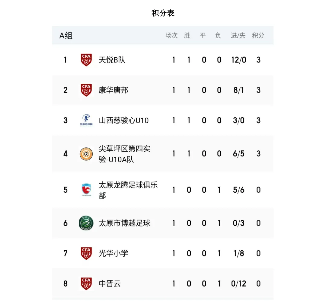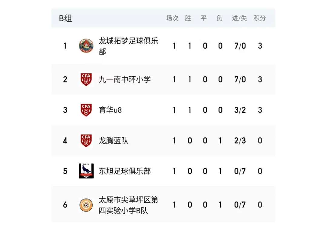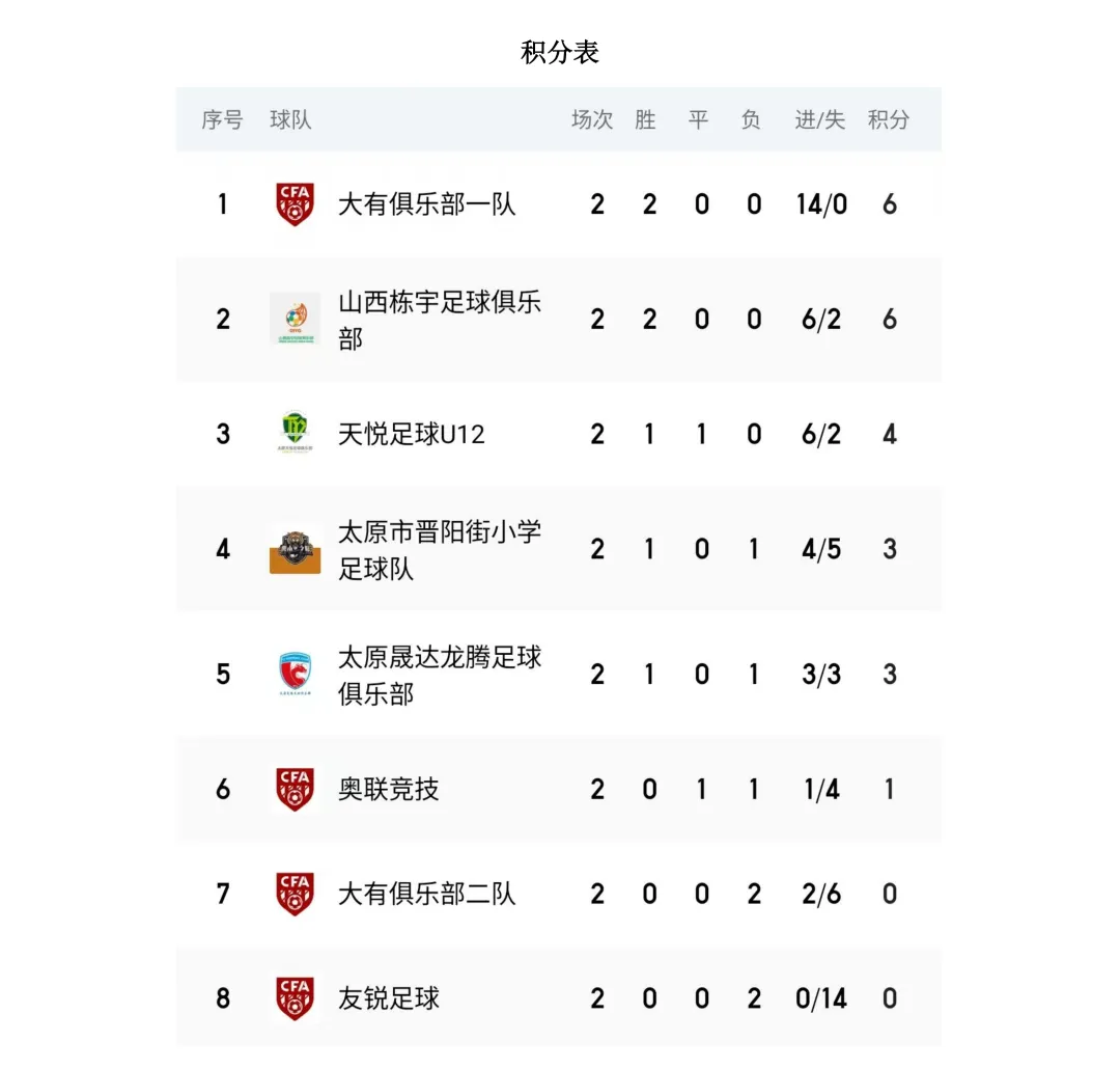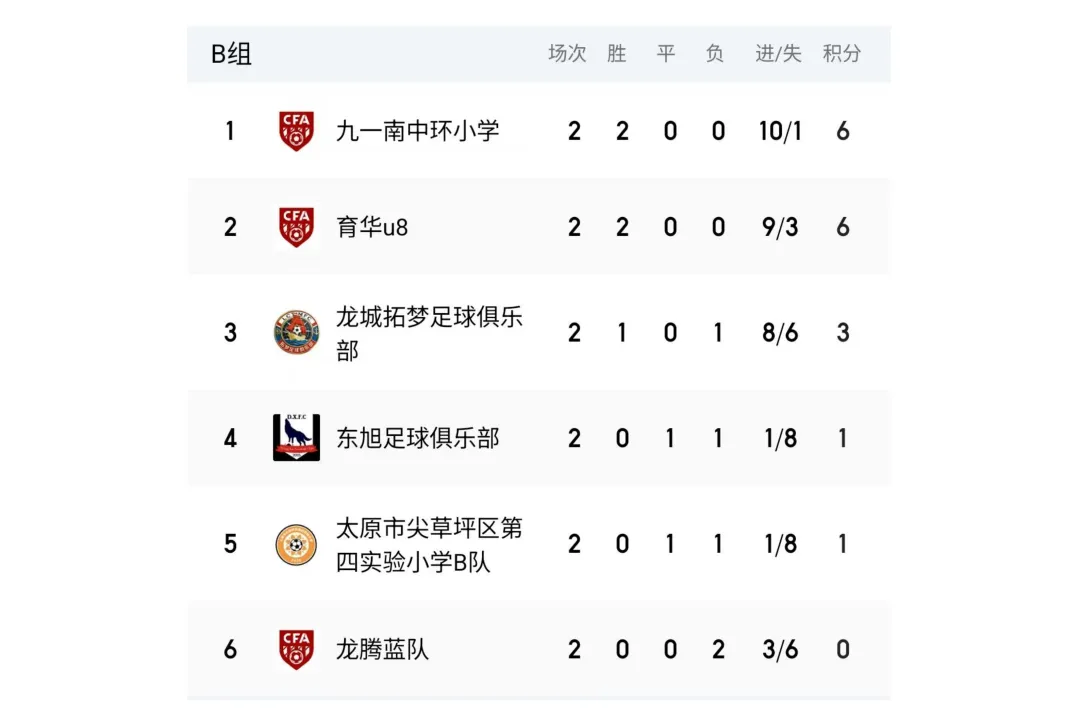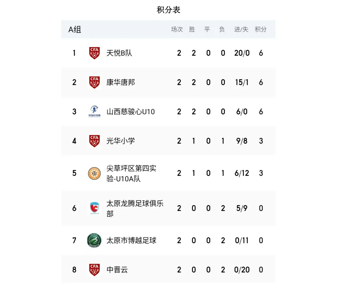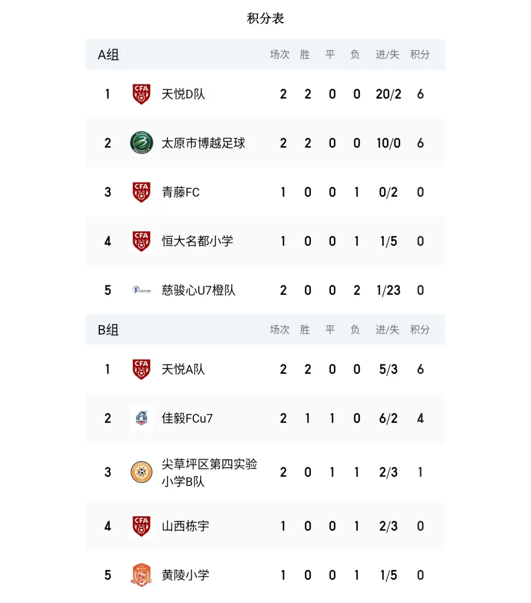 比赛设U7、U8、U9、U10、U11、U12六个年龄组别,其中U7、U8为五人制,U9、U10、U11、U12为八人制。两轮比赛结束后,各组别积分榜、射手榜初露峥嵘,小球员们用汗水与拼搏诠释了“奔跑吧·少年”的真正含义。经过前两轮的激烈拼杀,各组别比赛结果已新鲜出炉。以下为各组别前两轮战报。