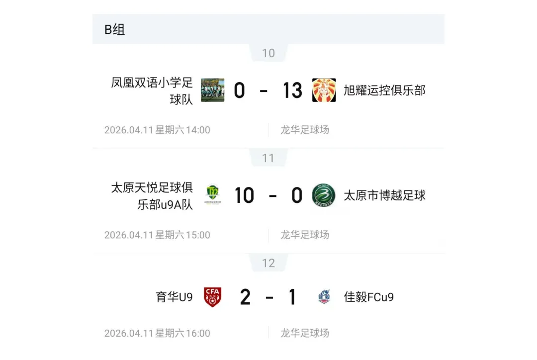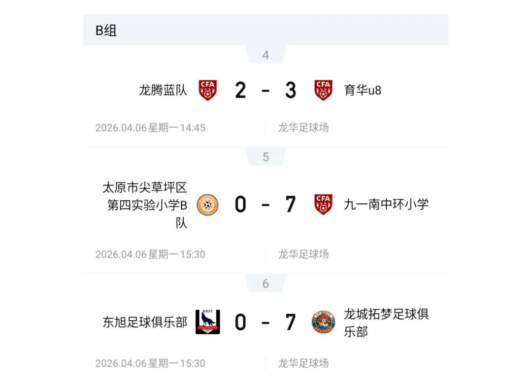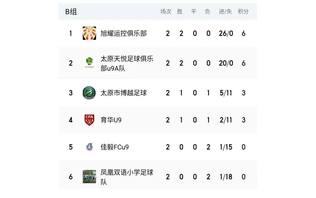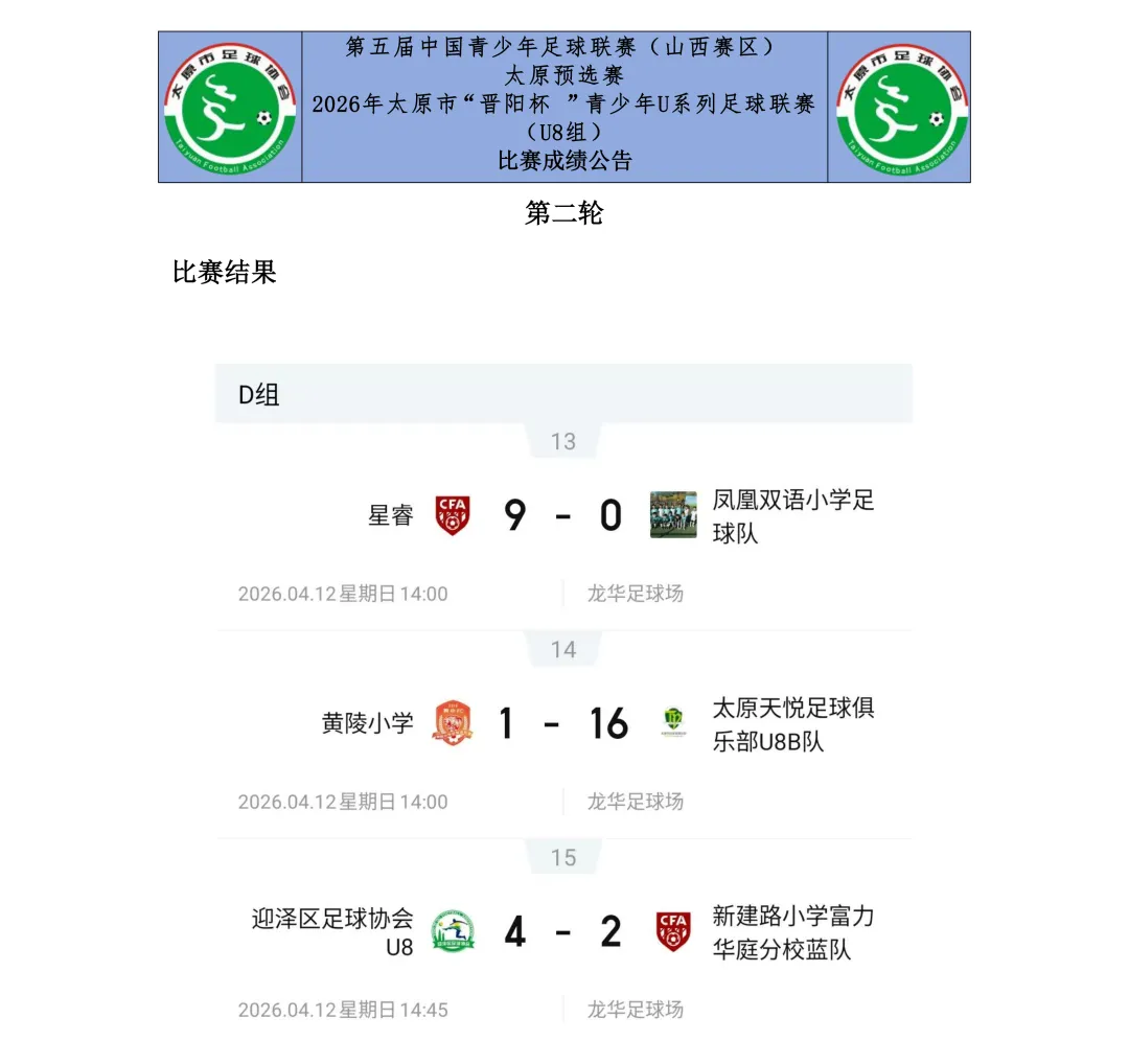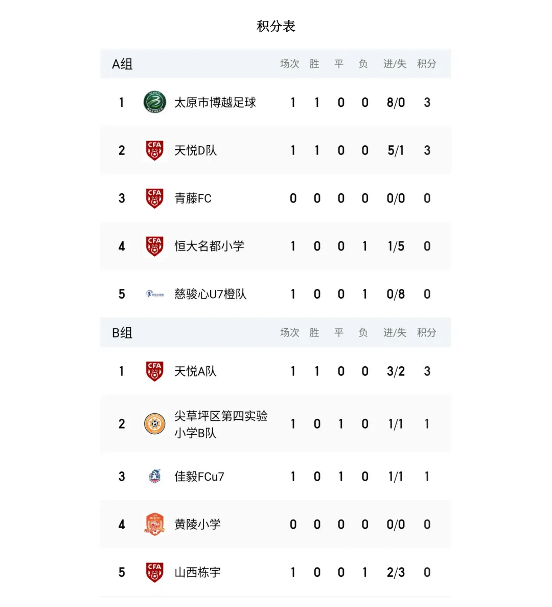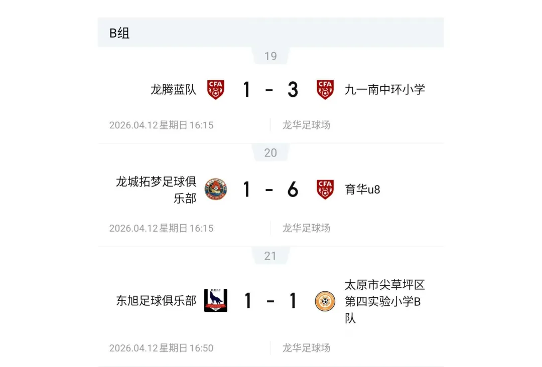 比赛设U7、U8、U9、U10、U11、U12六个年龄组别,其中U7、U8为五人制,U9、U10、U11、U12为八人制。两轮比赛结束后,各组别积分榜、射手榜初露峥嵘,小球员们用汗水与拼搏诠释了“奔跑吧·少年”的真正含义。经过前两轮的激烈拼杀,各组别比赛结果已新鲜出炉。以下为各组别前两轮战报。