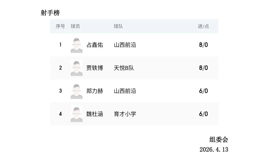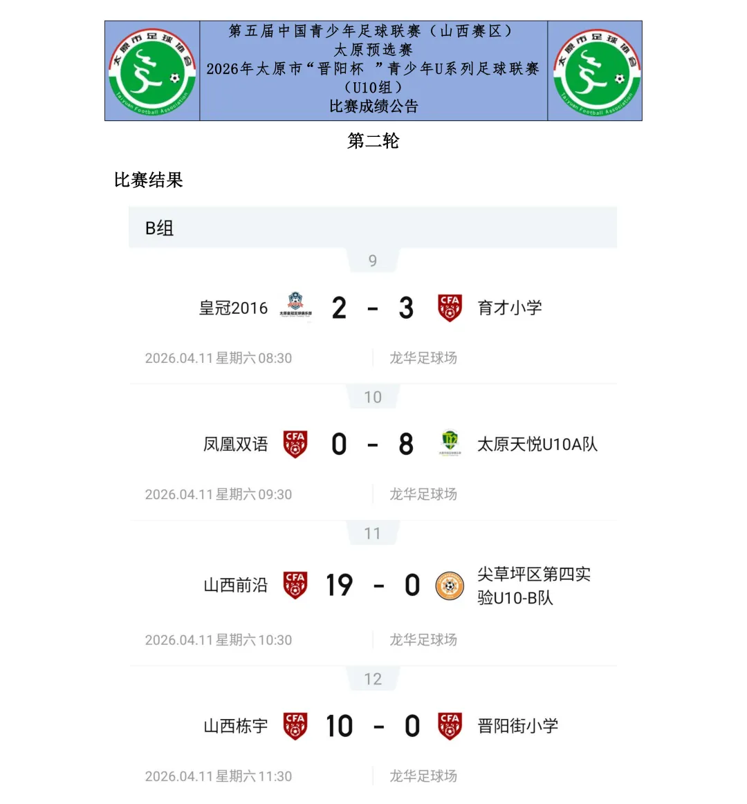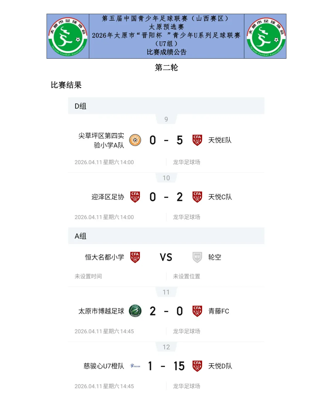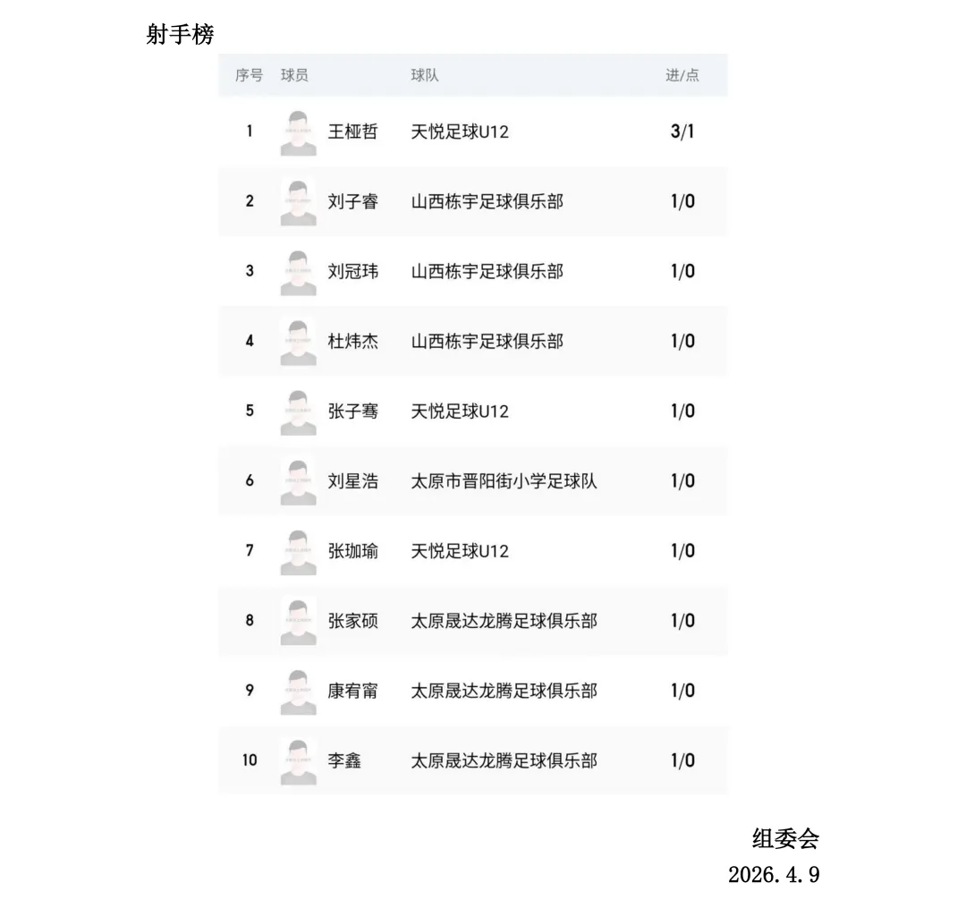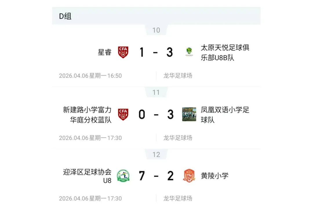 比赛设U7、U8、U9、U10、U11、U12六个年龄组别,其中U7、U8为五人制,U9、U10、U11、U12为八人制。两轮比赛结束后,各组别积分榜、射手榜初露峥嵘,小球员们用汗水与拼搏诠释了“奔跑吧·少年”的真正含义。经过前两轮的激烈拼杀,各组别比赛结果已新鲜出炉。以下为各组别前两轮战报。