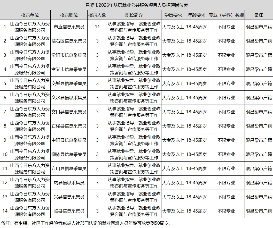 💡 吕梁市基层就业公共服务项目人员招聘50人