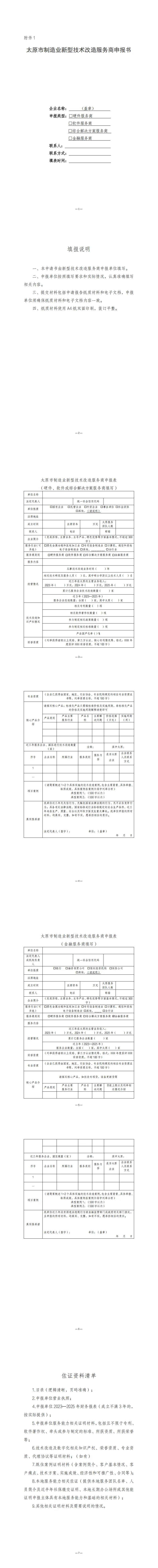 各县(市、区)、开发区(园区)工业和信息化主管部门:根据《太原市制造业新型技术改造城市试点(2025-2028年)工作方案》,为加快推进我市制造业新型技术改造城市试点工作,拟组织开展太原市制造业新型技术改造服务商(第一批)征集工作,现将有关事项通知如下。本次征集主要面向为制造业新型技术改造提供各类专业服务的机构,共分为以下四个类别。各服务商可根据自身主营业务、技术能力及服务范围,选择对应类别进行申报。(一)硬件服务商。能够为制造业企业提供新型技术改造所需各类硬件设备的服务商,重点涵盖工业母机、增材制造、工业机器人、智能专用装备、智能检测设备、自动化成套生产线等智能制造装备领域,能够围绕生产设备数控化改造、产线自动化升级、工艺环节提质增效等提供硬件集成与实施服务。(二)软件服务商。能够为制造业企业提供工业软件及信息化解决方案的服务商,主要包括研发设计类软件(如CAD/CAE/CAM)、生产过程执行系统(MES)、高级计划排程系统(APS)、产品全生命周期管理(PLM)、企业资源计划系统(ERP)、供应链管理系统(SCM)、工业自动化控制系统(DCS/PLC)等软件产品,能够围绕设备联网、数据采集、系统集成、信息安全等提供信息化解决方案。(三)综合解决方案服务商。能够为制造业企业提供技术改造整体设计、咨询规划及系统集成服务的服务商,重点涵盖智能工厂和数字化车间整体解决方案、工业互联网平台建设、数字化转型诊断咨询、标准制定、系统集成与运维、项目总包等服务,能够为企业提供硬件、软件与平台一体化的综合服务。(四)金融服务商。能够为制造业企业技术改造项目提供金融支持的各类机构,主要包括银行、融资租赁公司、股权投资机构等,能够针对技术改造项目提供专项贷款、设备融资租赁、股权投资、保险保障等多元化金融产品及服务。(一)申报硬件、软件以及综合解决方案服务商的单位,须满足以下基本条件:1、具有独立法人资格,运营和财务状况良好,具有良好的社会信用记录。2、有较强的本地技术改造服务快速响应能力,服务团队的人员数量和构成相对稳定,技术服务团队人员不少于5人,能够持续稳定提供高质量服务。3、有相关技术服务资质,服务内容与制造业新型技术改造相关,遵守相关工作规范和流程。4、近三年未发生重大安全(含网络安全、数据安全)、质量、环境等事故以及违法违规行为。5、近三年有在太原市范围内且与申报方向相关的服务案例。1、依法设立的银行、融资租赁公司、股权投资机构、保险公司等金融机构或类金融机构,具有良好的社会信用记录。2、具备针对制造业企业技术改造项目的专项金融产品或服务方案,能够提供项目贷款、设备融资租赁、股权投资、保险保障等多元化金融支持。在太原市配备稳定的本地化服务团队,具备快速响应企业融资需求的能力。3、近三年在太原市范围内,有支持企业数字化转型,技术改造或者其他相关项目的实际业务落地案例。4、近三年没有因违法违规行为被金融监管部门或政府有关部门查处,造成恶劣影响。本次征集的服务商,技术服务能力应重点服务于黑色金属冶炼和压延加工、专用设备制造以及计算机、通信和其他电子设备制造业等行业。同时,也欢迎服务于其他制造业领域,或具备为多行业提供跨领域解决方案能力的服务商积极参与。(一)参与供需对接与诊断服务。入选服务商将优先参与我市组织的制造业企业技术改造需求调研、现场诊断和供需对接活动,深入了解企业实际需求,精准匹配技术改造解决方案,拓展业务合作渠道。(二)优先推荐参与试点项目。入选服务商将纳入太原市制造业新型技术改造服务商推荐名录,优先向全市制造业企业进行推介,并有机会参与国家及市级新型技术改造试点项目、示范项目的实施,共同打造行业标杆。(三)纳入服务资源池统一宣传。入选服务商将统一纳入太原市制造业新型技术改造服务资源池,通过市工信局官方网站、产业对接活动、新闻媒体等渠道进行宣传推广,提升品牌影响力和市场竞争力。对于入选太原市制造业新型技术改造服务资源池的服务商,与需求企业对接主要通过以下两种方式。一是自主对接。当企业有技术改造服务需求时,可通过市工信局官方网站、服务商推荐名录、供需对接活动等渠道,查询并联系到合适的服务商。服务商在接收到企业意向后,可进一步接洽、明确需求。双方协商一致后,即可签订服务合同并开展合作。二是经政府推荐对接。根据企业技术改造服务需求及企业意愿从资源池中匹配服务商,与企业进行第一轮对接洽谈。若企业在初步推荐名单中未选定服务商,则进行第二轮全库推荐直至匹配成功。市工信局将全程跟踪服务,协助双方推进合作。本次制造业新型技术改造服务商遴选由企业(单位)自主申报、县(市、区)或开发区(园区)推荐、专家评审、公示确认等环节组成,具体流程如下。(一)各服务商须严格按照征集通知要求,填写《太原市制造业新型技术改造服务商申报书》(附件1),并提交至属地工业和信息化主管部门审查。(二)各县(市、区)、开发区(园区)工业和信息化主管部门于2026年4月30日前将3份推荐文件(包含服务商推荐汇总表,附件2)和2份制造业新型技术改造服务商申报材料及1份电子版报送市工信局。(三)市工信局负责本