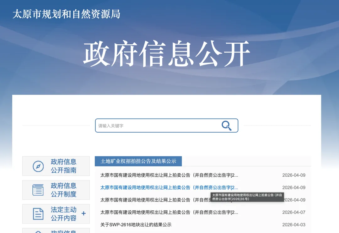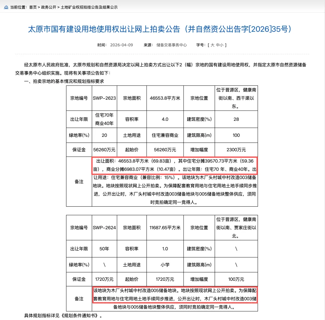 2026年4月9日,太原规资局发布四宗土地相关挂牌公示:其中,太原市国有建设用地使用权出让网上拍卖公告(并自然资公出告字[2026]35号)!