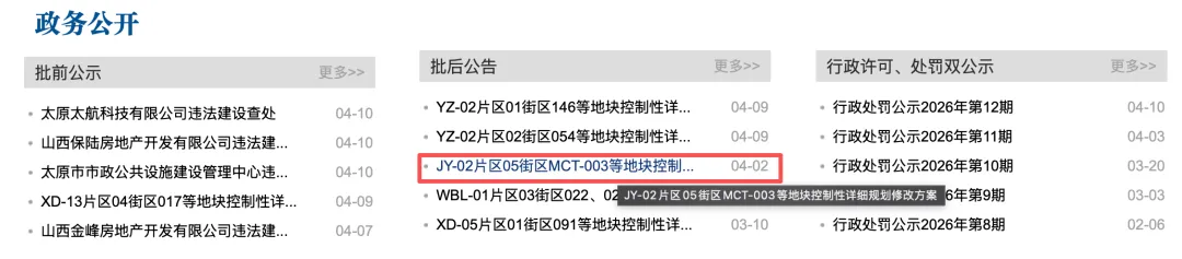根据2026年4月2日太原市规资局相关公示:JY-02片区05街区MCT-003等地块控制性详细规划修改方案!