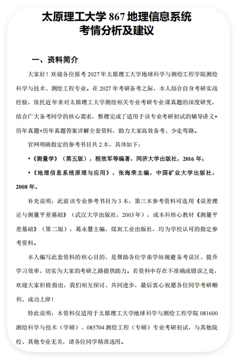 867测绘地理信息综合基础为太原理工大学自命题专业课,由原测绘综合基础867和地理信息系统原理866于2022年合并而来。本资料严格围绕指定教材及历年真题编写,贴合院校命题规律。