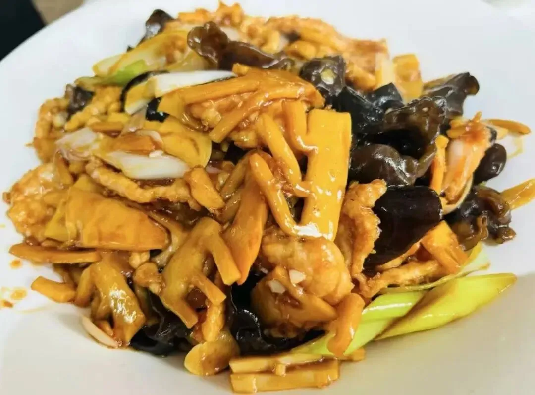 正宗的太原过油肉,选的是最嫩的猪里脊,切成如硬币厚的薄片。它的高级感来源于那道“过油”的火候:肉片在油锅里滑开,颜色变得金黄油亮,却锁住了里面的肉汁。搭配上木耳、玉兰片和蒜苗,大火快炒,出锅前那一勺山西老陈醋才是真正的神来之笔。