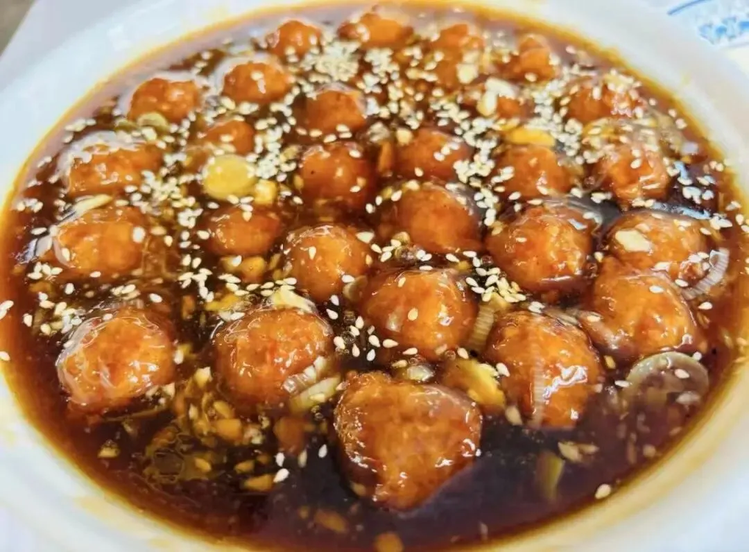 太原的糖醋丸子,个头比乒乓球略小,讲究的是**“外壳如焦炭般酥脆,内里如豆腐般绵软”**。丸子是用猪肉泥加葱姜水反复摔打上劲,下锅炸到外皮起酥。最绝的是那个挂浆,太原的糖醋汁讲究的是“拉丝不脱落”,酱红色的汁液紧紧包裹在丸子上,透着玻璃般的光泽。