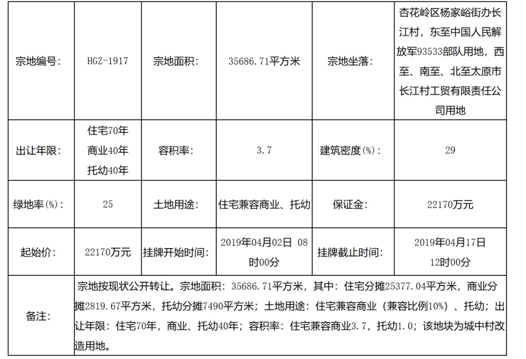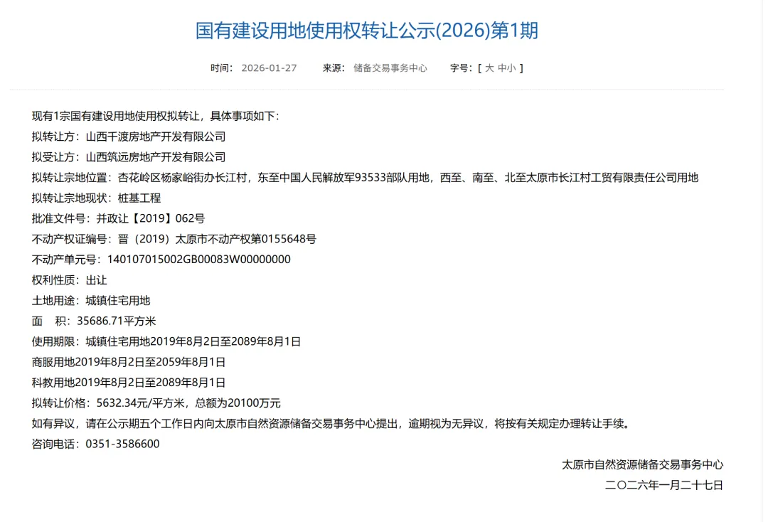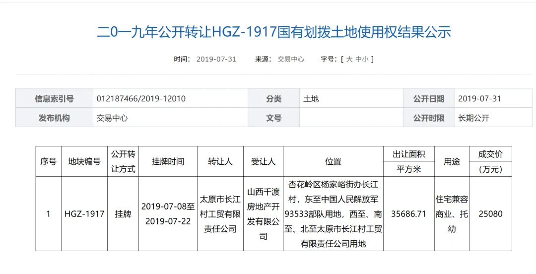 而后,2019年的7月31日,地块划拨结果公示:地块由太原市长江村工贸有限责任公司转让为山西千渡房地产开发有限公司,地块溢价率为13.13%。
