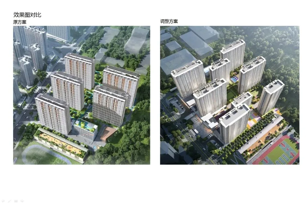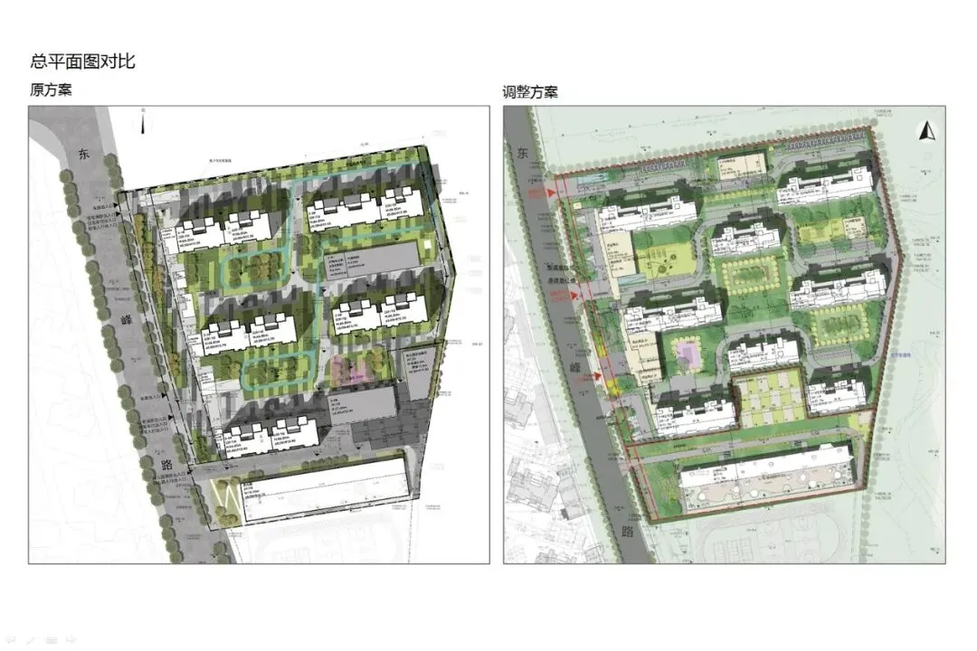 新方案对楼座位置进行了微调。虽然容积率依然维持在 3.7,但通过调整楼栋间距和朝向,增加了小区内部的核心景观节点。