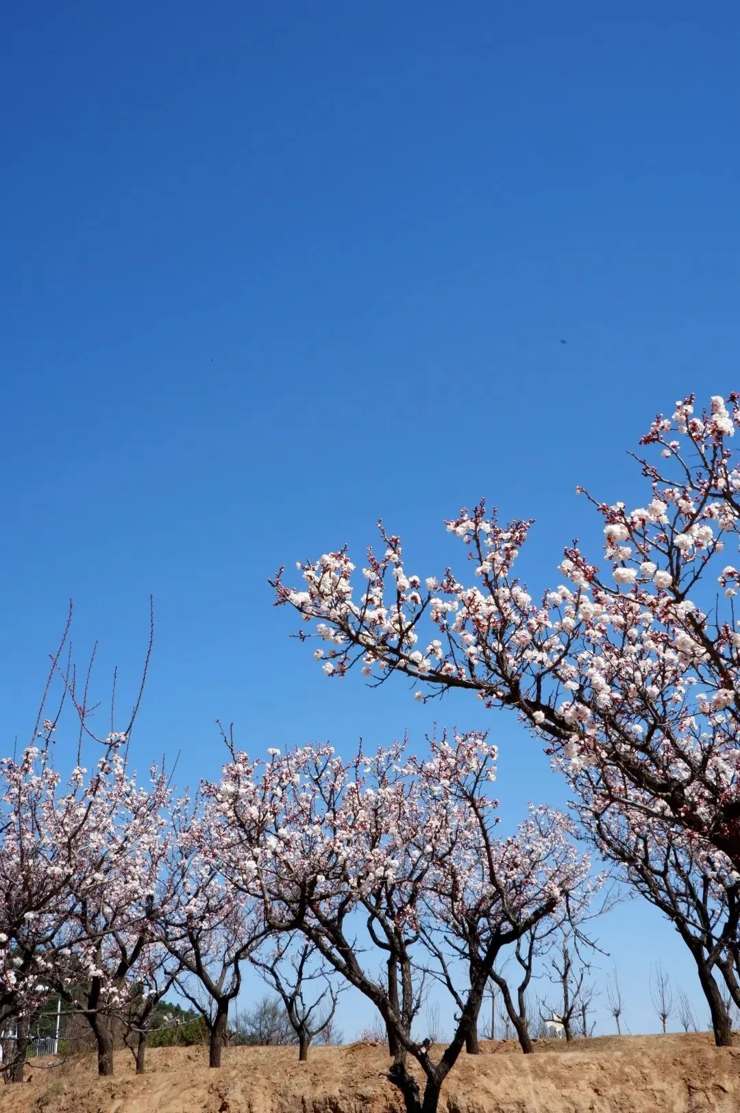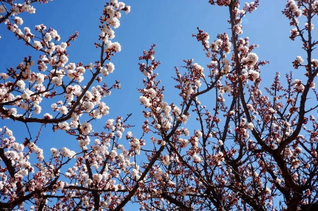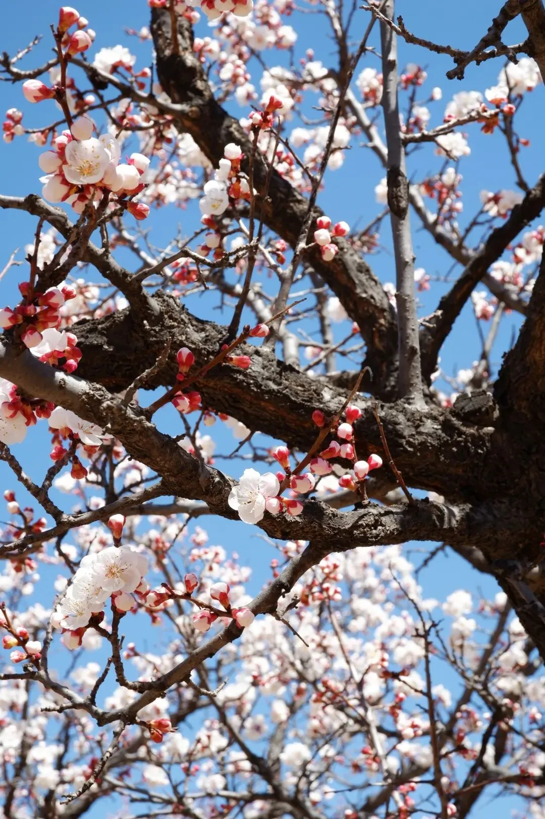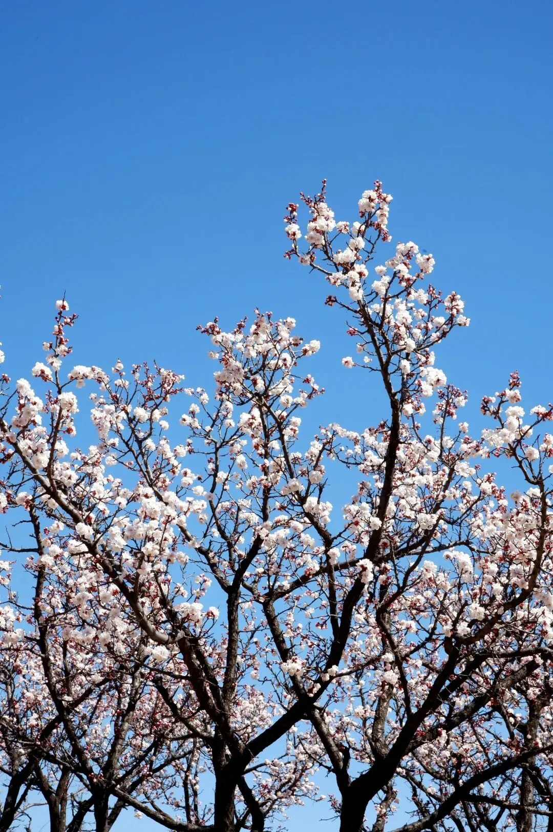当天,车行驶到这边,人很少,天很蓝,花开得极好。我的第一感觉就是杏树,因为形状像极了梵高画里的杏树,低矮的,粗壮的,整齐的,黢黑的树干,圆滚滚的花骨,盛放的部分像在朝天大叫似的,好是爽朗和热闹。虽然明显是人工种植,但一点都不影响我们的观赏兴致。