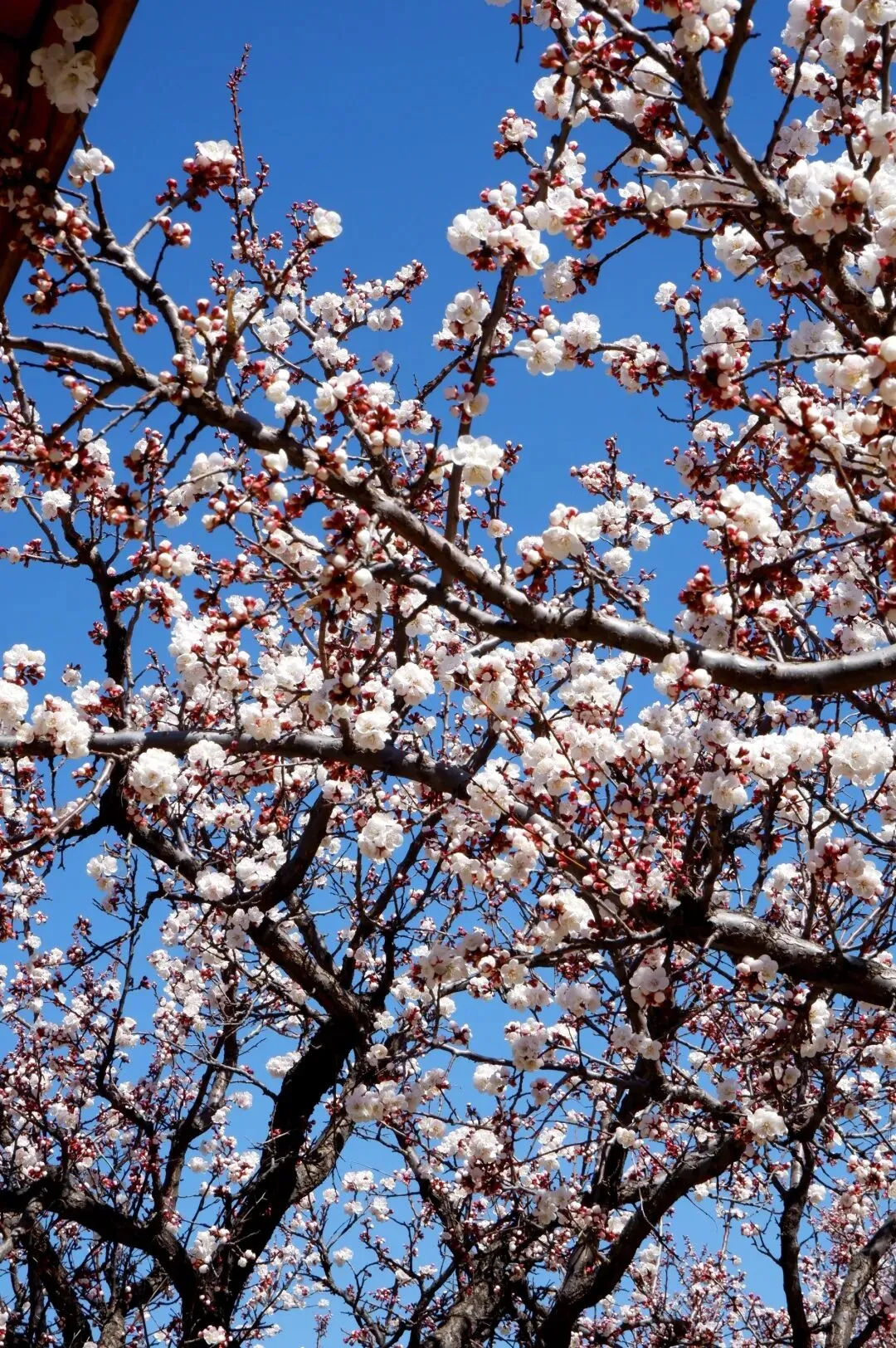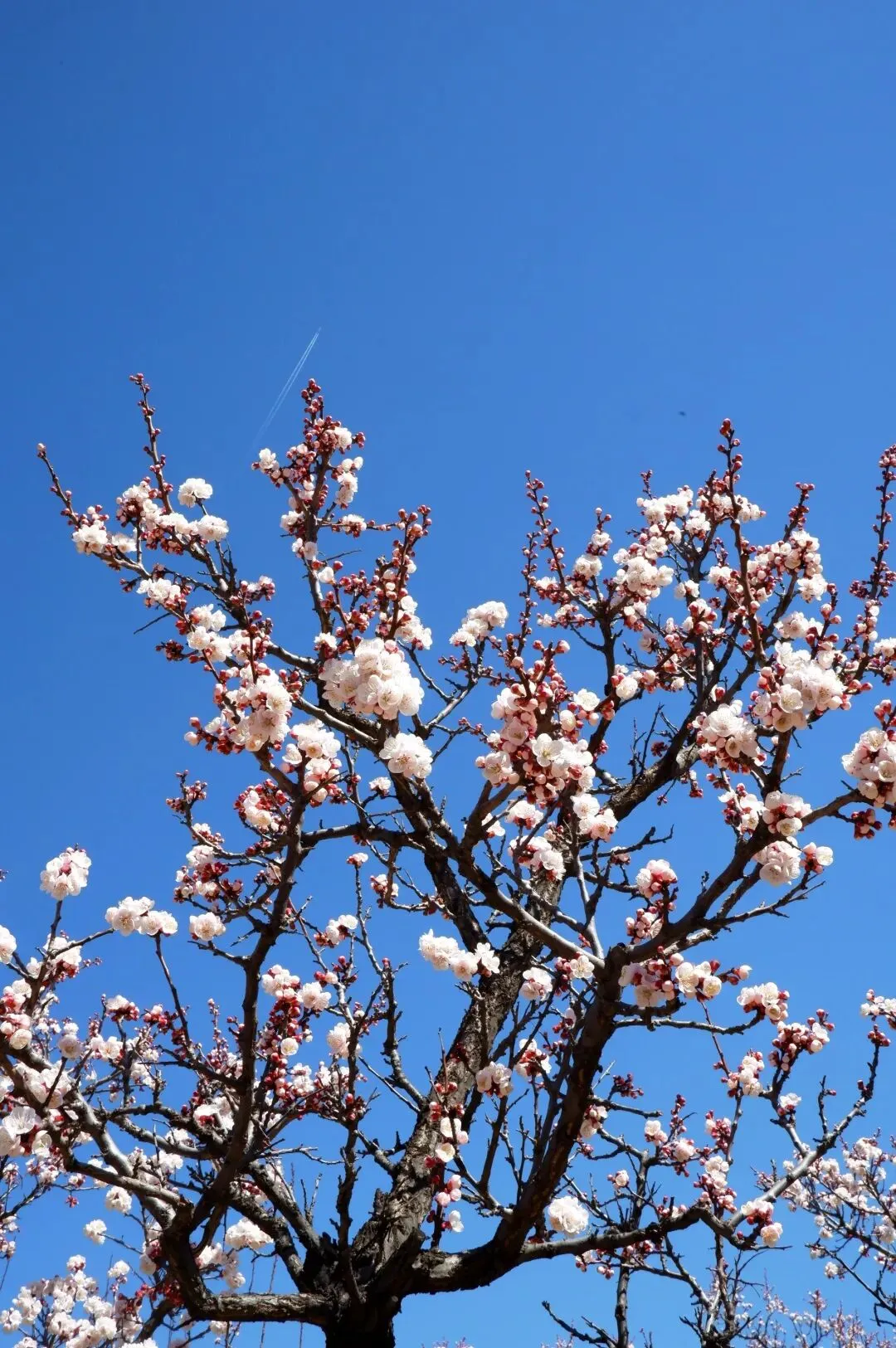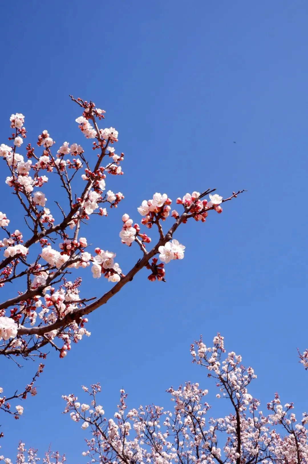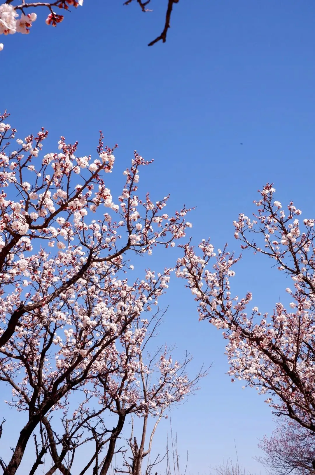 当天,车行驶到这边,人很少,天很蓝,花开得极好。我的第一感觉就是杏树,因为形状像极了梵高画里的杏树,低矮的,粗壮的,整齐的,黢黑的树干,圆滚滚的花骨,盛放的部分像在朝天大叫似的,好是爽朗和热闹。虽然明显是人工种植,但一点都不影响我们的观赏兴致。